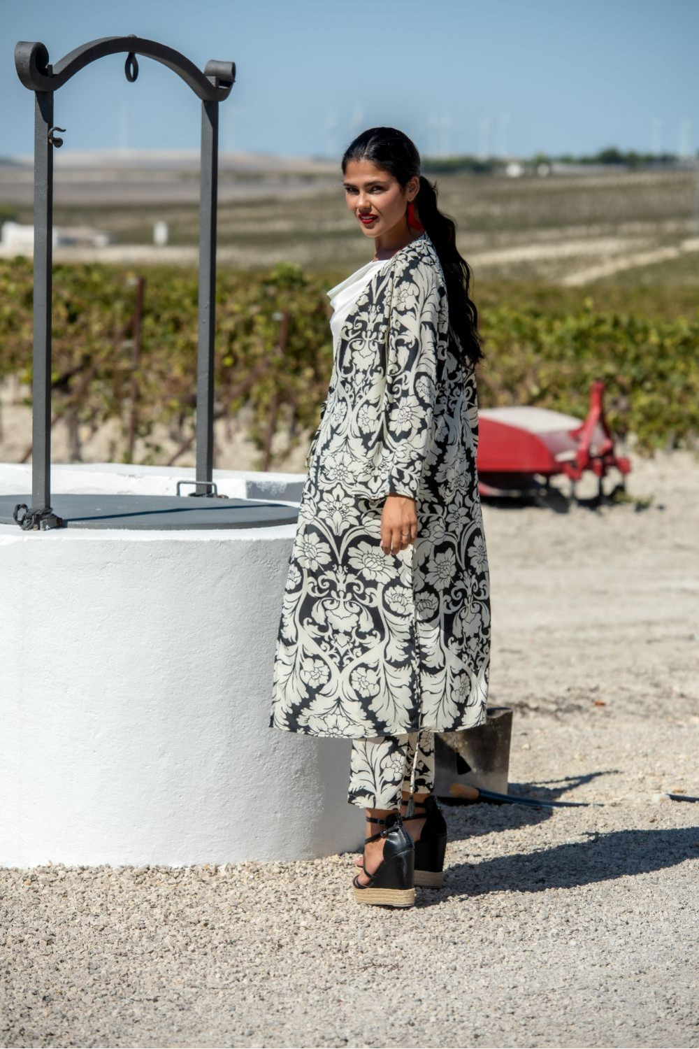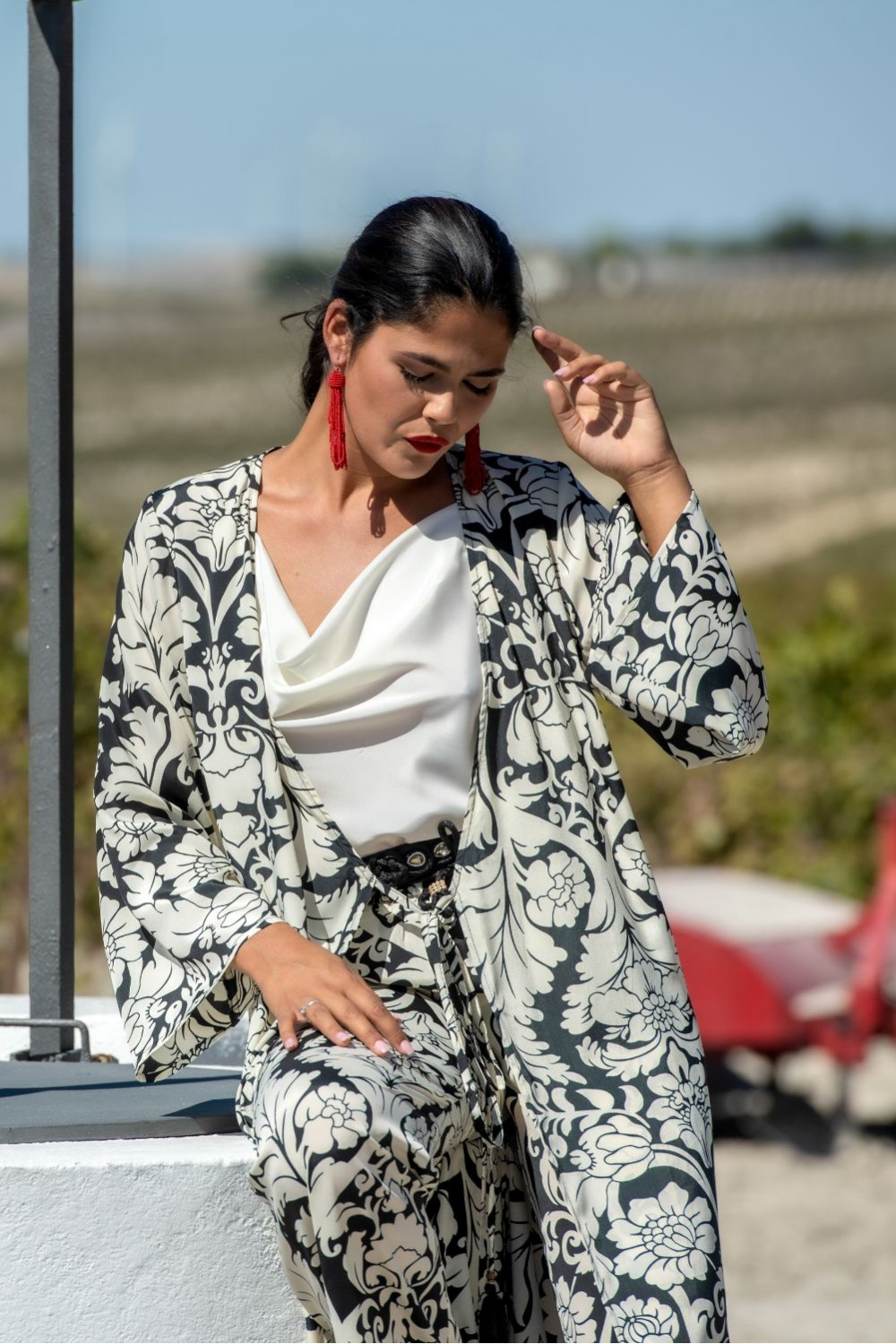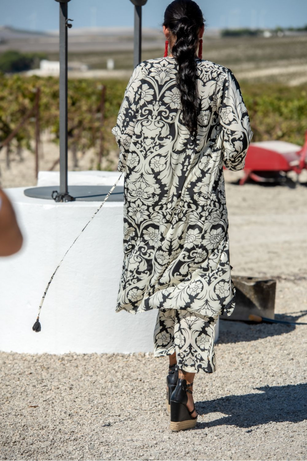 Chaqueta en satén con cuello esmoquin abrochada con un botón y mangas con volante capa negra con lunares beige.COMPOSICIÓN: 100%POLIESTER