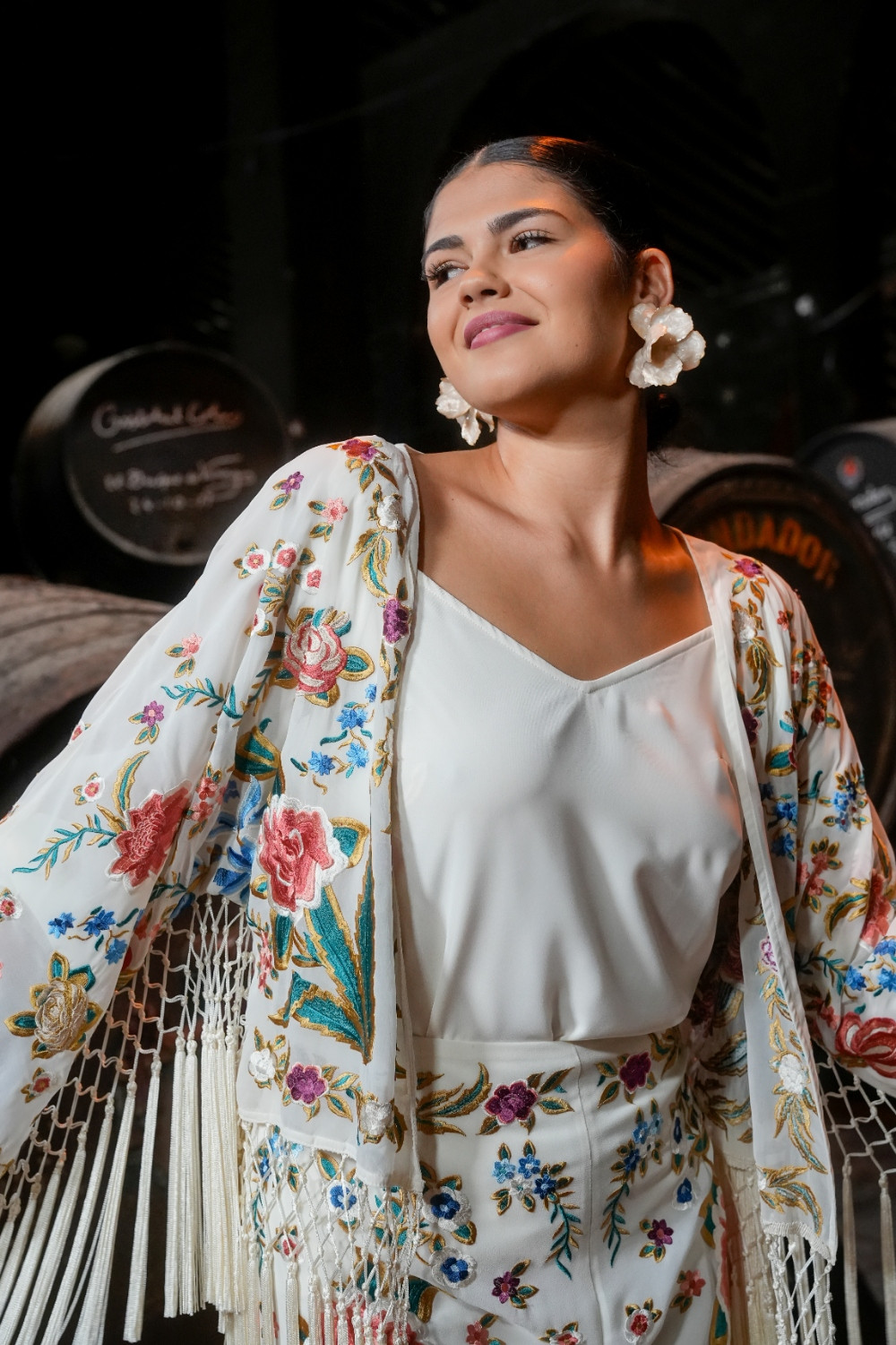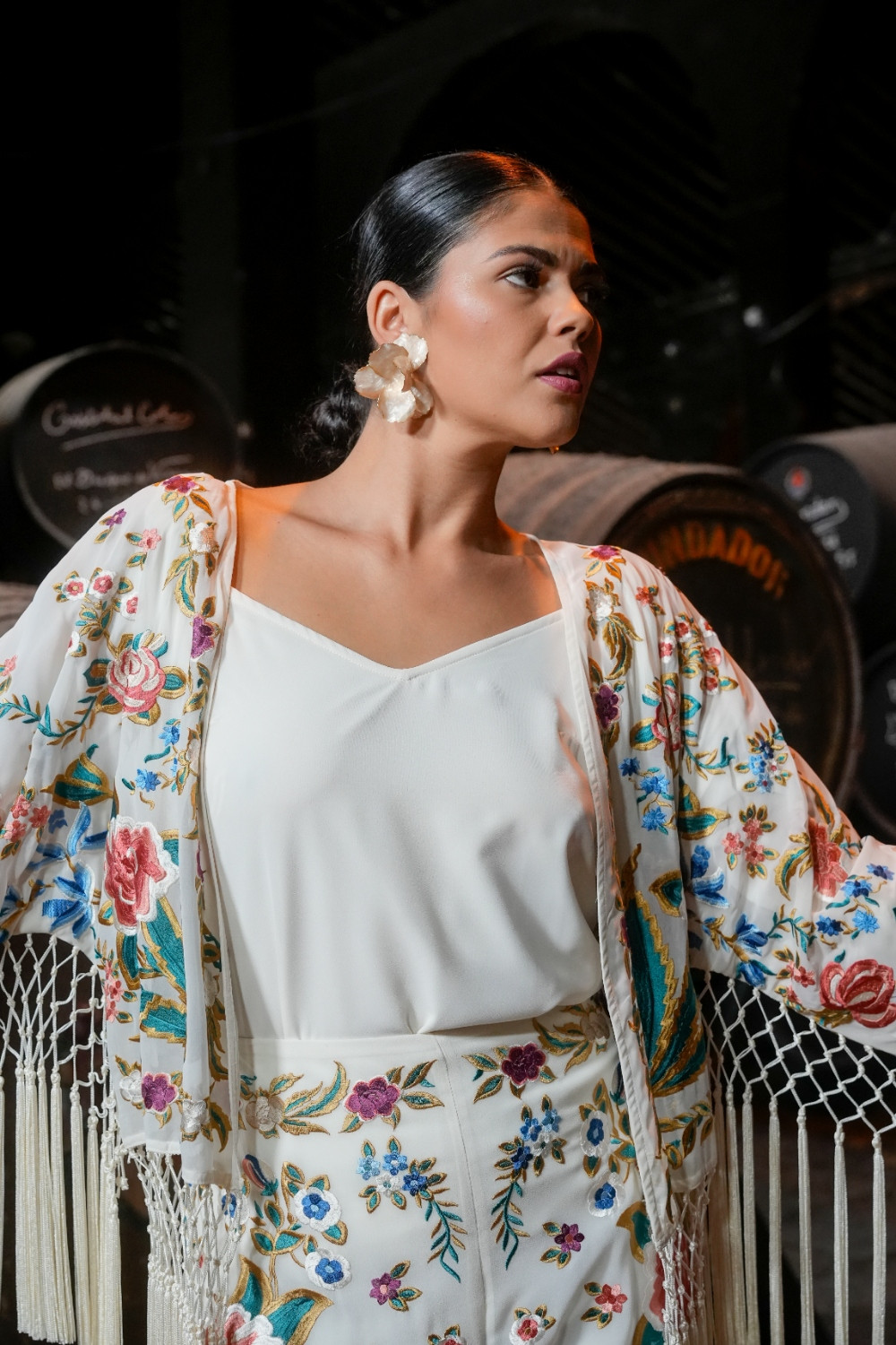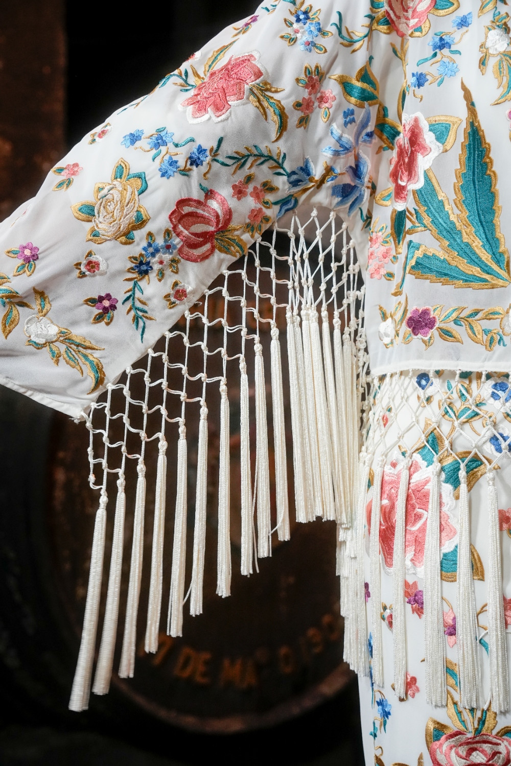 Chaqueta Valle marfil de gasa. manga francesa bordada mantón con motivos florale. flecos en el bajo y por debajo de la manga káhyra COMPOSICIÓN: 100% POLIÉSTER ACCESORIOS: FLECOS 100% VISCOSA