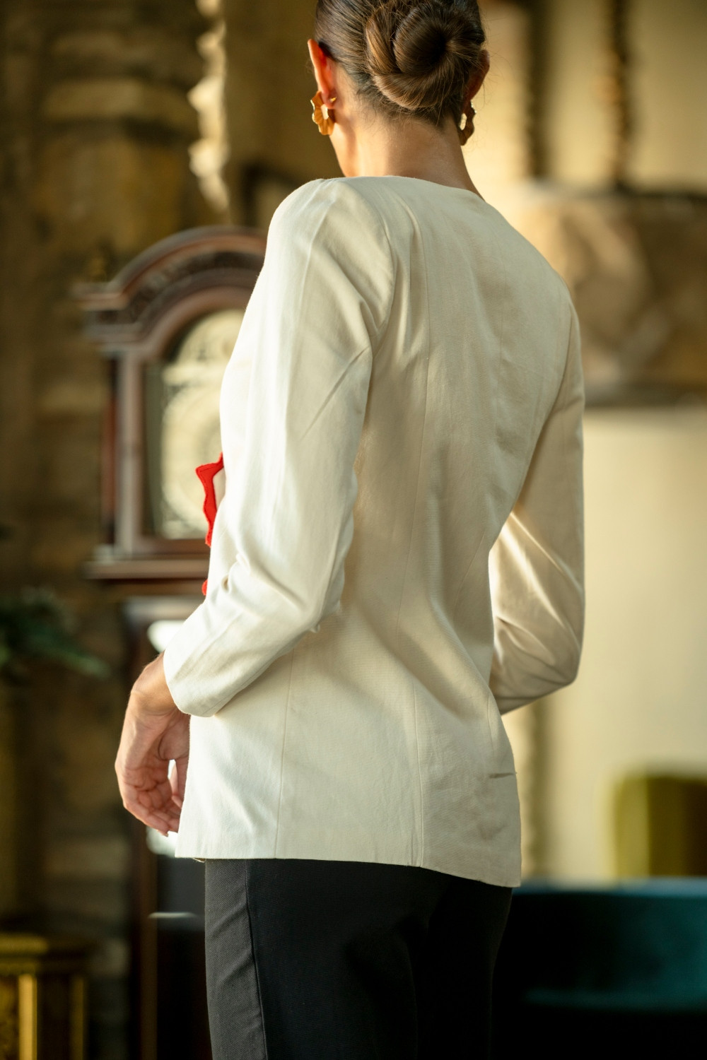 Chaqueta clavellina marfi con clavel rojo cruzado y manga larga Káhyra. COMPOSICIÓN: 100% ALGODÓN FORRO: LINING 100% POLIÉSTER