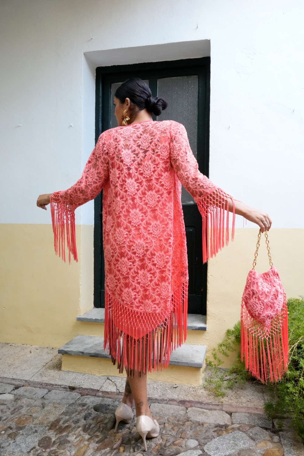 Chaqueta Saeta salmón de encaje terminada en flecos enrejados en magas y filo Káhyra. COMPOSICIÓN: 100%POLIÉSTER ACCESORIOS: FLECOS-100% POLIÉSTER