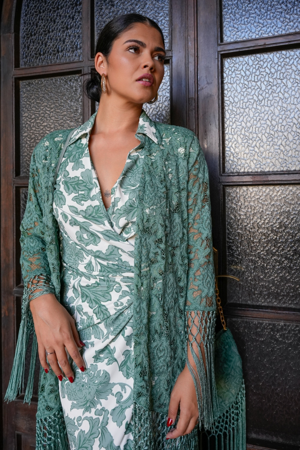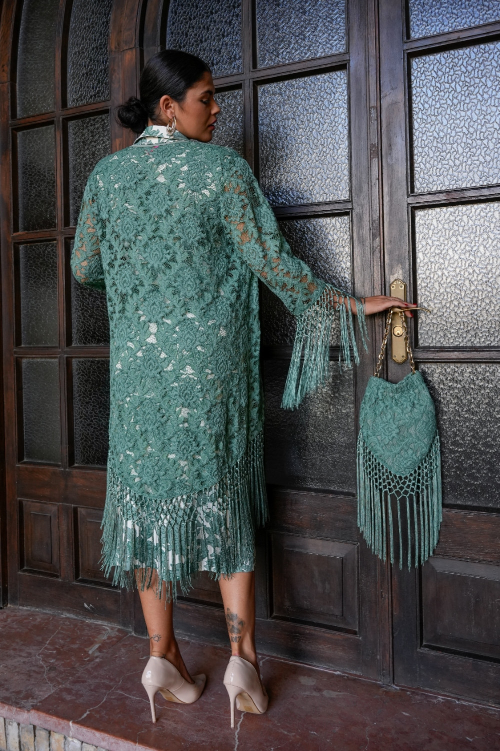 Chaqueta Saeta aqua de encaje terminada en flecos enrejados en magas y filo Káhyra. COMPOSICIÓN: 100%POLIÉSTER ACCESORIOS: FLECOS-100% POLIÉSTER