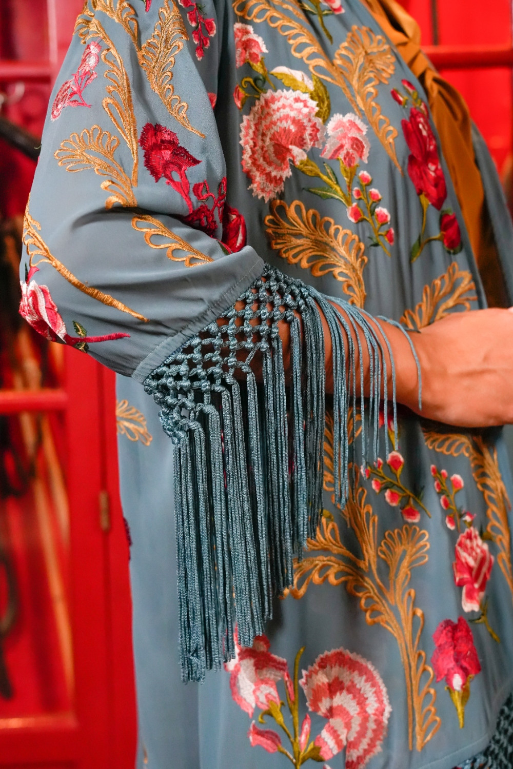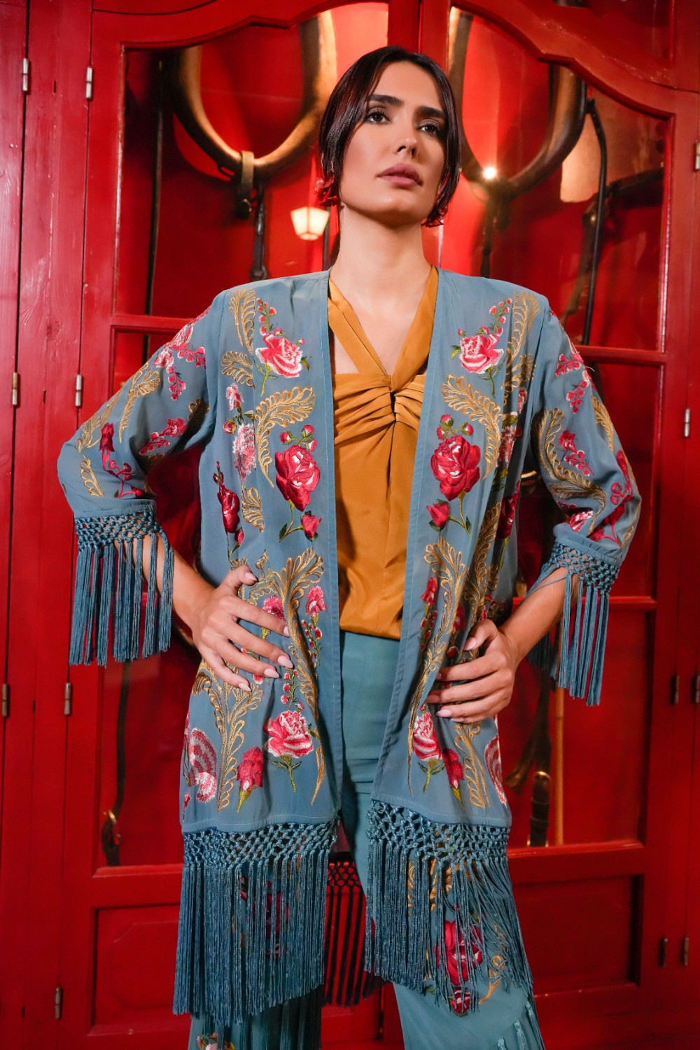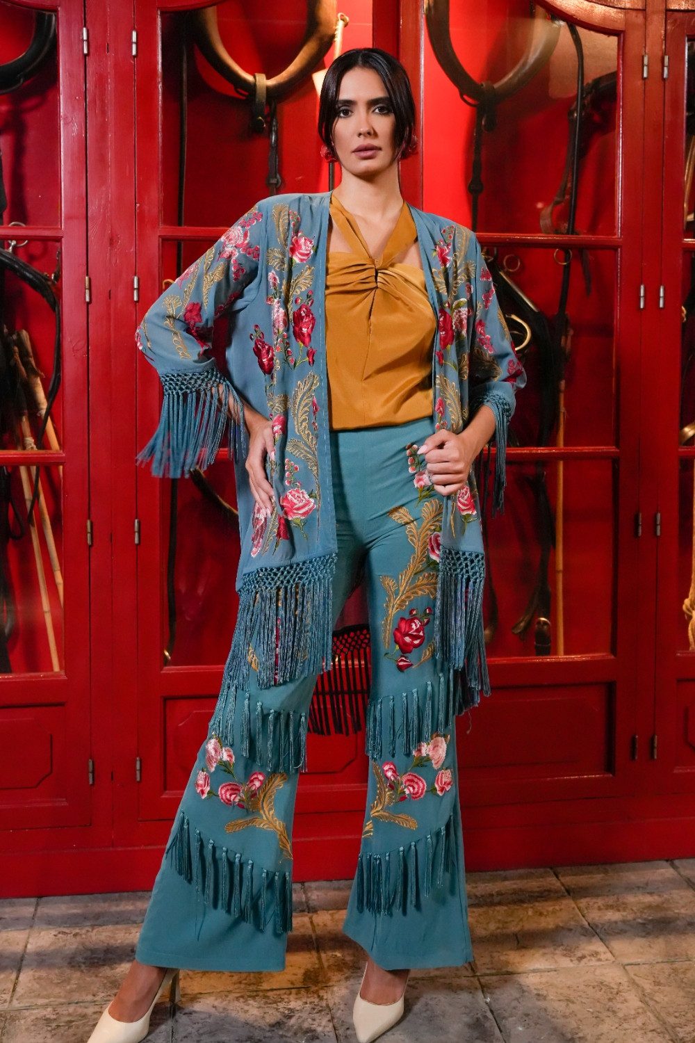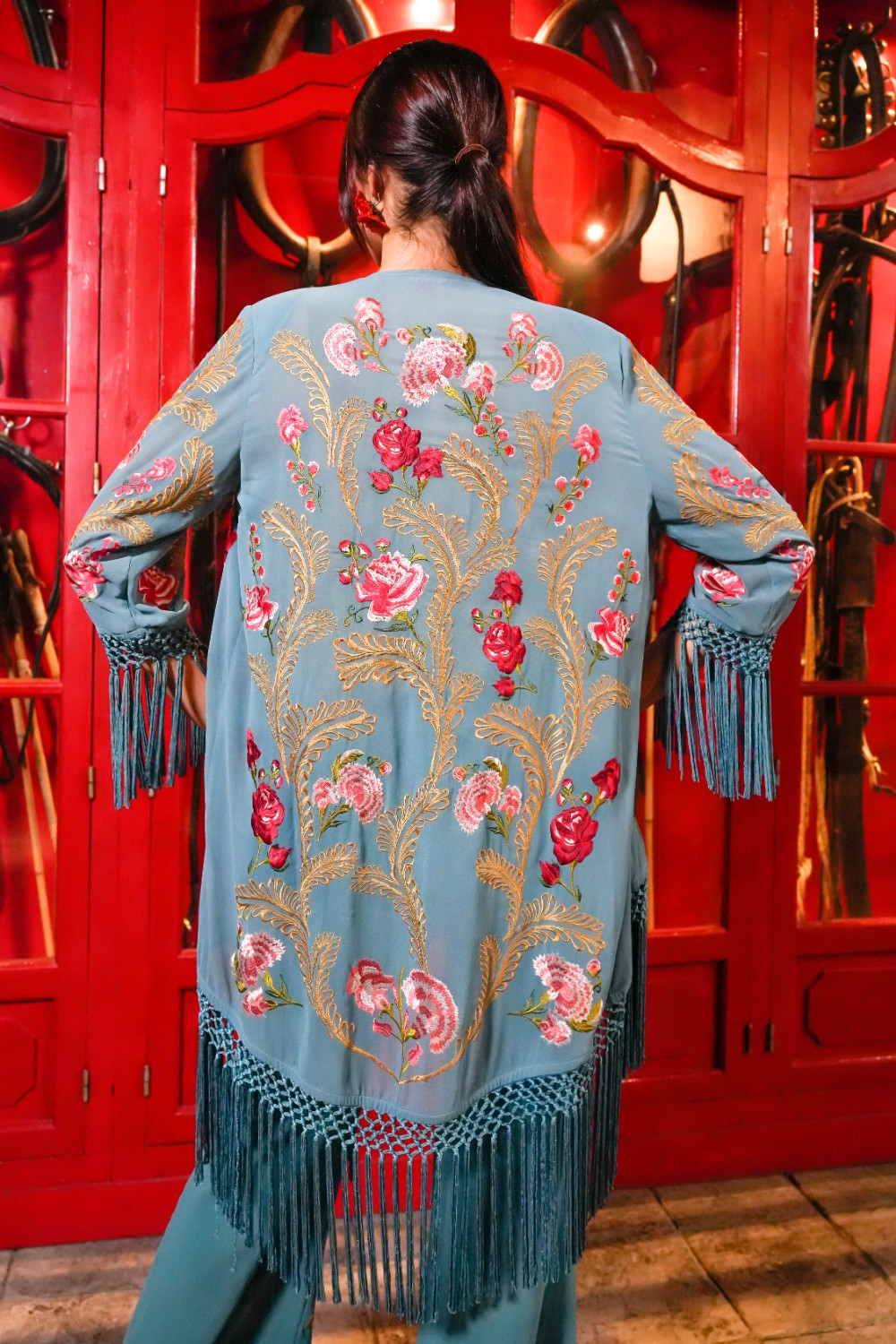 Chaqueta Pasodoble de gasa en tono aqua bordado con rosas y claveles de inspiración torera y flecos al tono Káhyra.