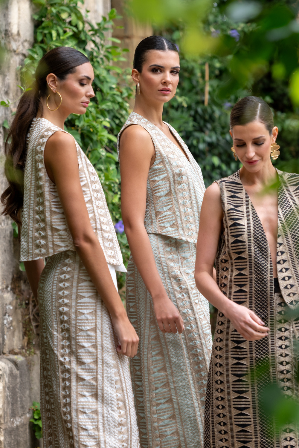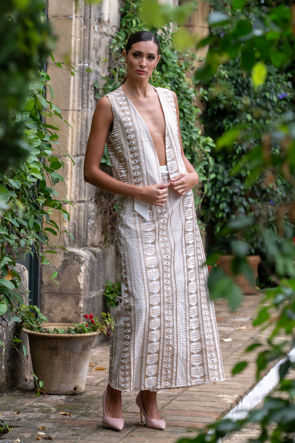 Chaleco beige bordado geométrico con hilo bronce. Calidad: 50% Algodón 50% Poliéster - Forro: 80% Poliéste 20%Algodón