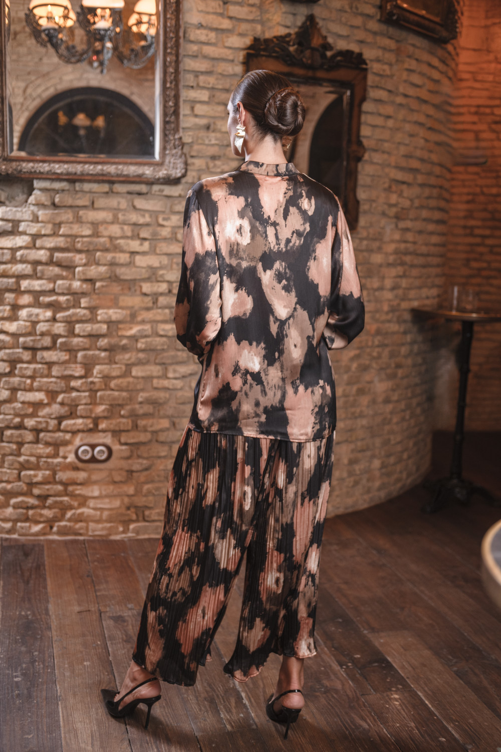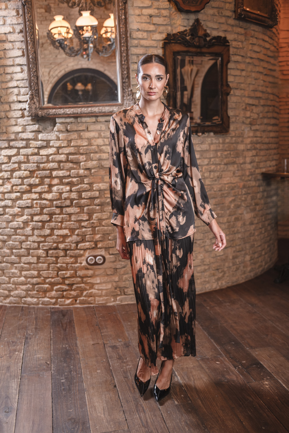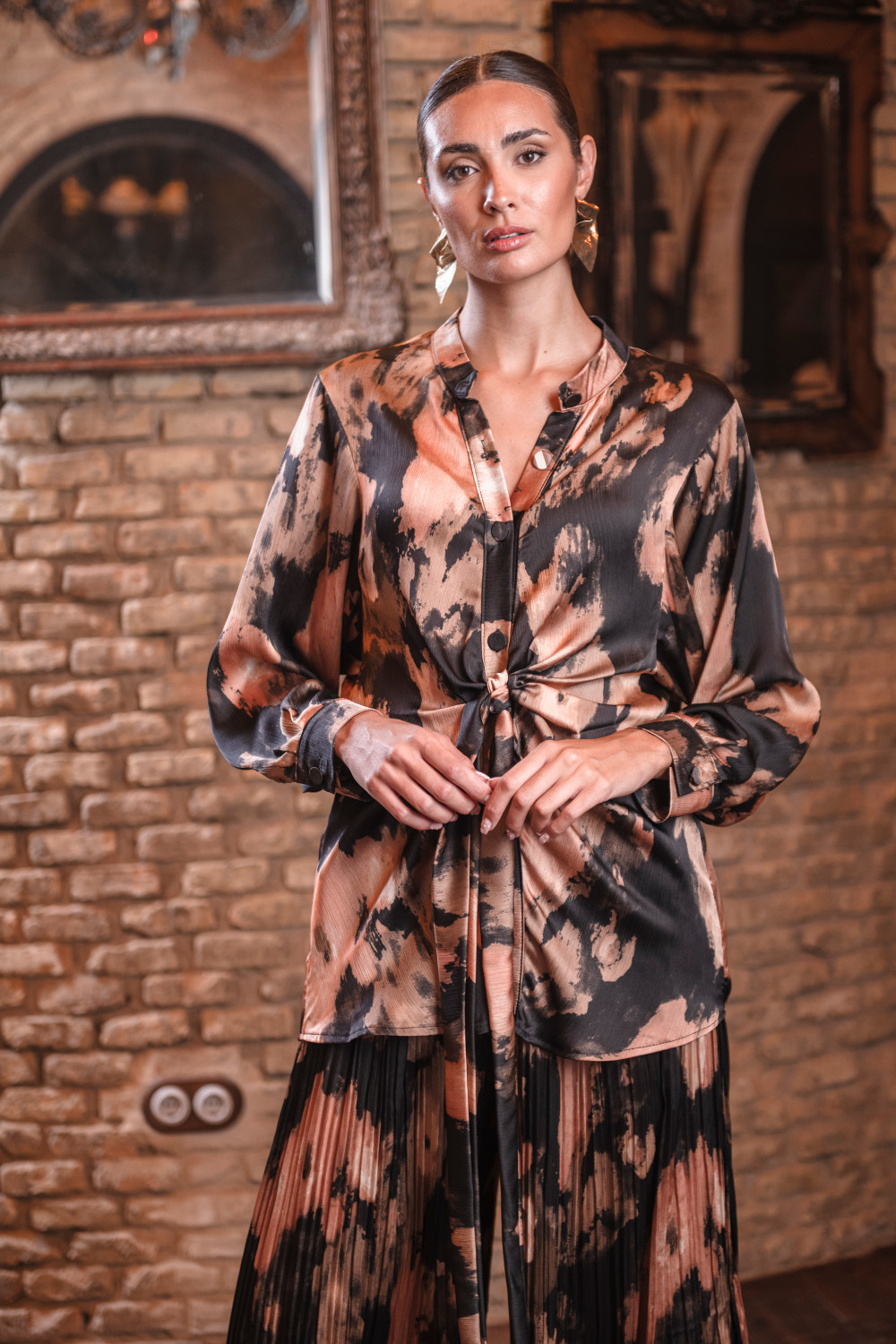 Conjunto 2 piezas Azafrán polisilk top camisero con fajín cruzado incorporado y pantalon plisado midi estampado de fondo negro y manchas en tonos nudes y beige