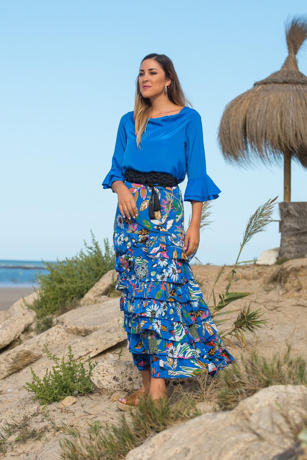 Falda larga Feria volantes estampado Jardín Azul con margaritas.