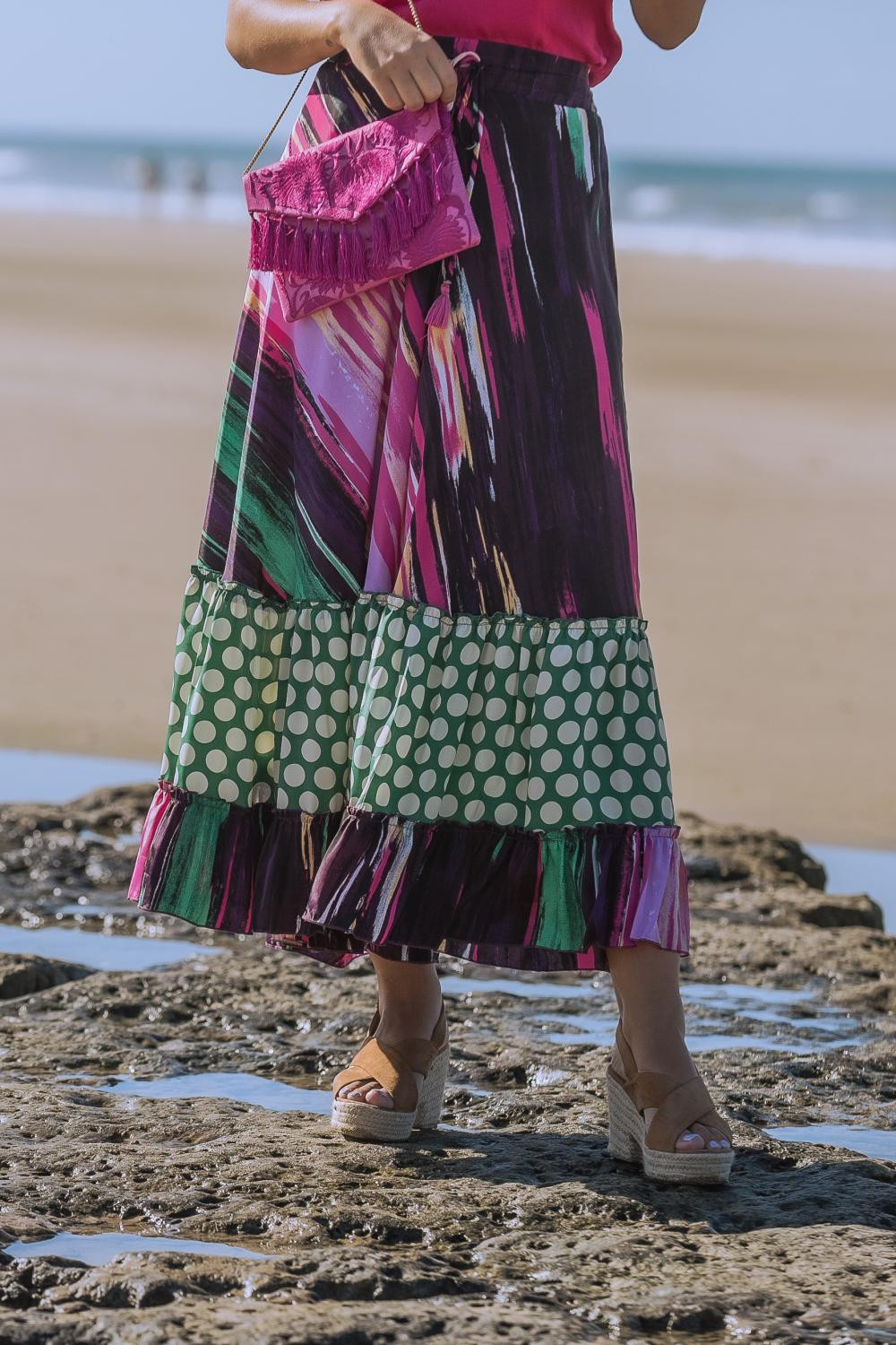 Falda larga de capa con volantes potchwor lunares y tie dye morados.