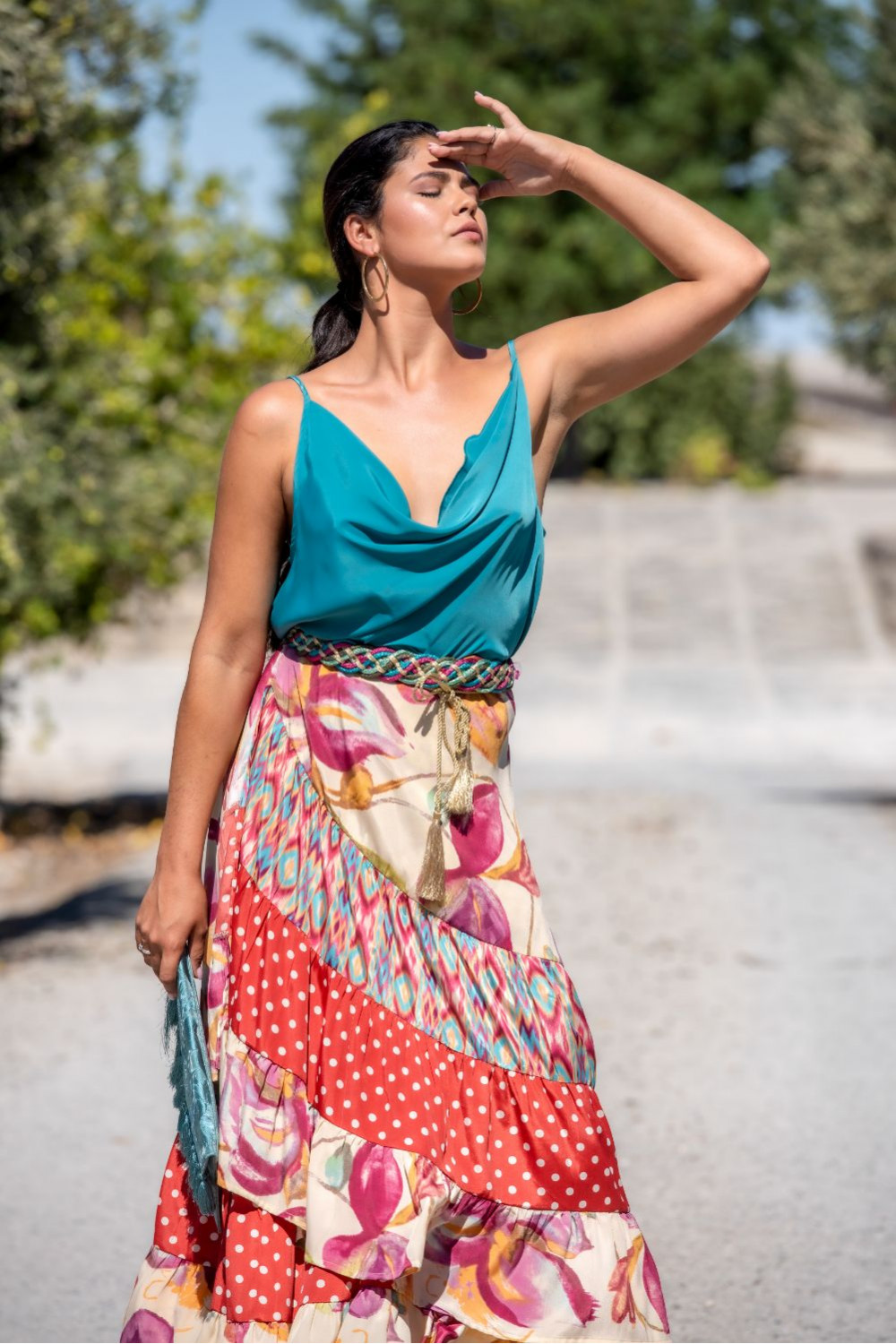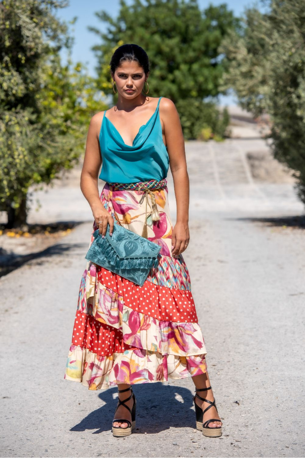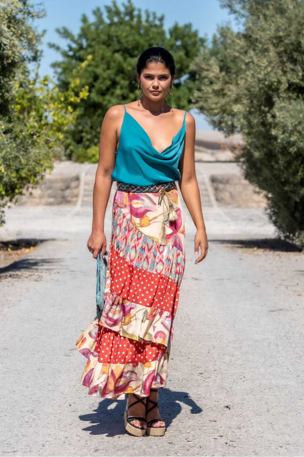 Falda pareo capri en polysilk de volantes canasteros con estampado de cachemira en verde agua combinado verde agua con lunar beige.CALIDAD: 70% POLIESTER 30% SEDA