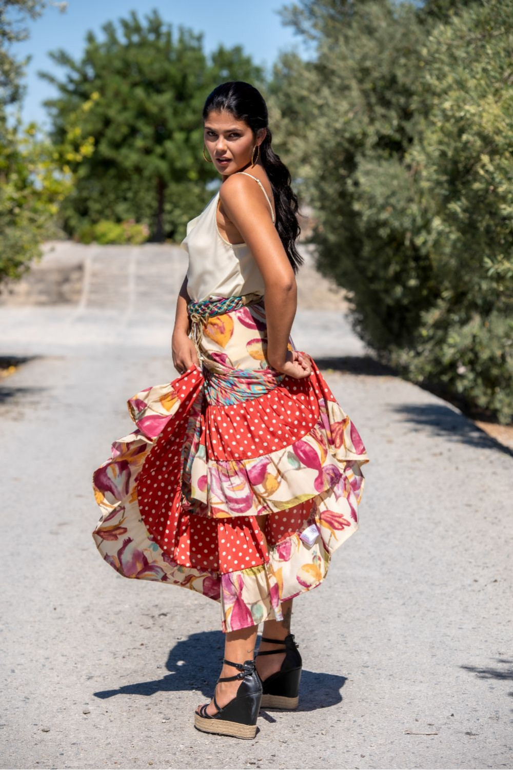 Falda pareo cream soleo en polysilk de volantes canasteros combinando estampados de lunar coral y beige con otros estampados beige con flores rosas , motivos verde agua y geométricos.