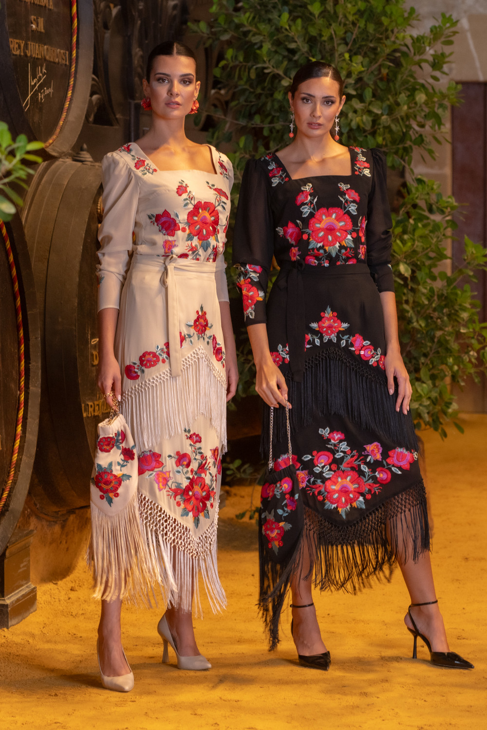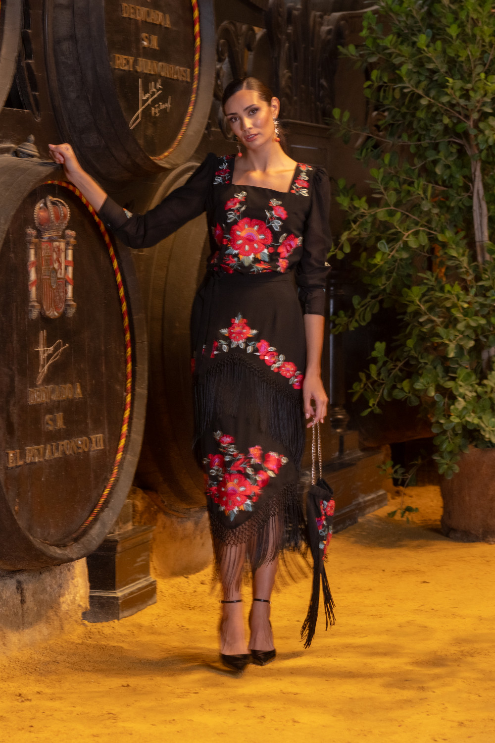 Falda negra bordada flores mantón multicolor, con sobre fleco enrejado.