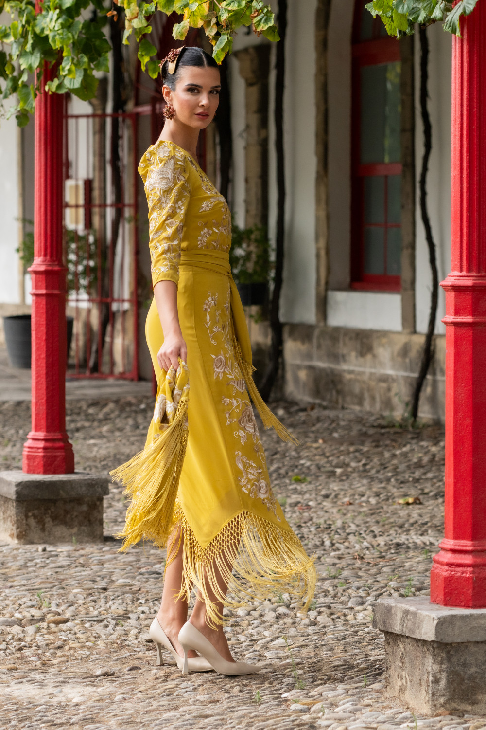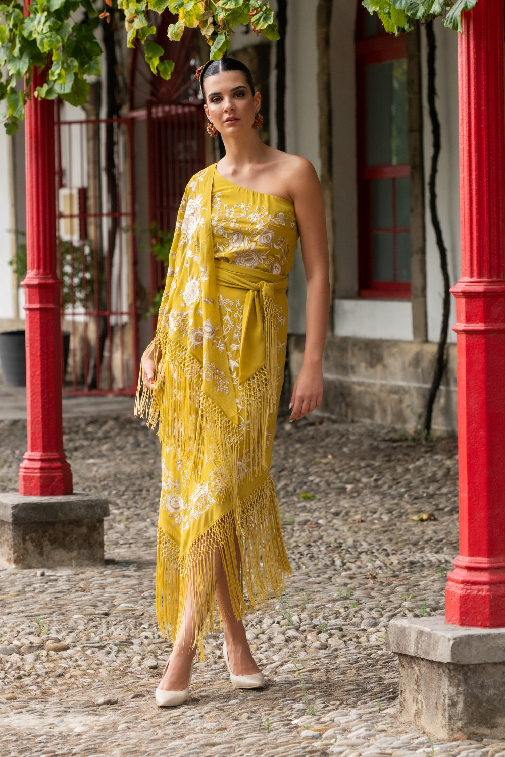 Top asimétrico mostaza bordado de flores mantón y pájaros, manga fruncido al hombro, francesa.Calidad: 100% Poliéster - Forro:100% Poliéster punto