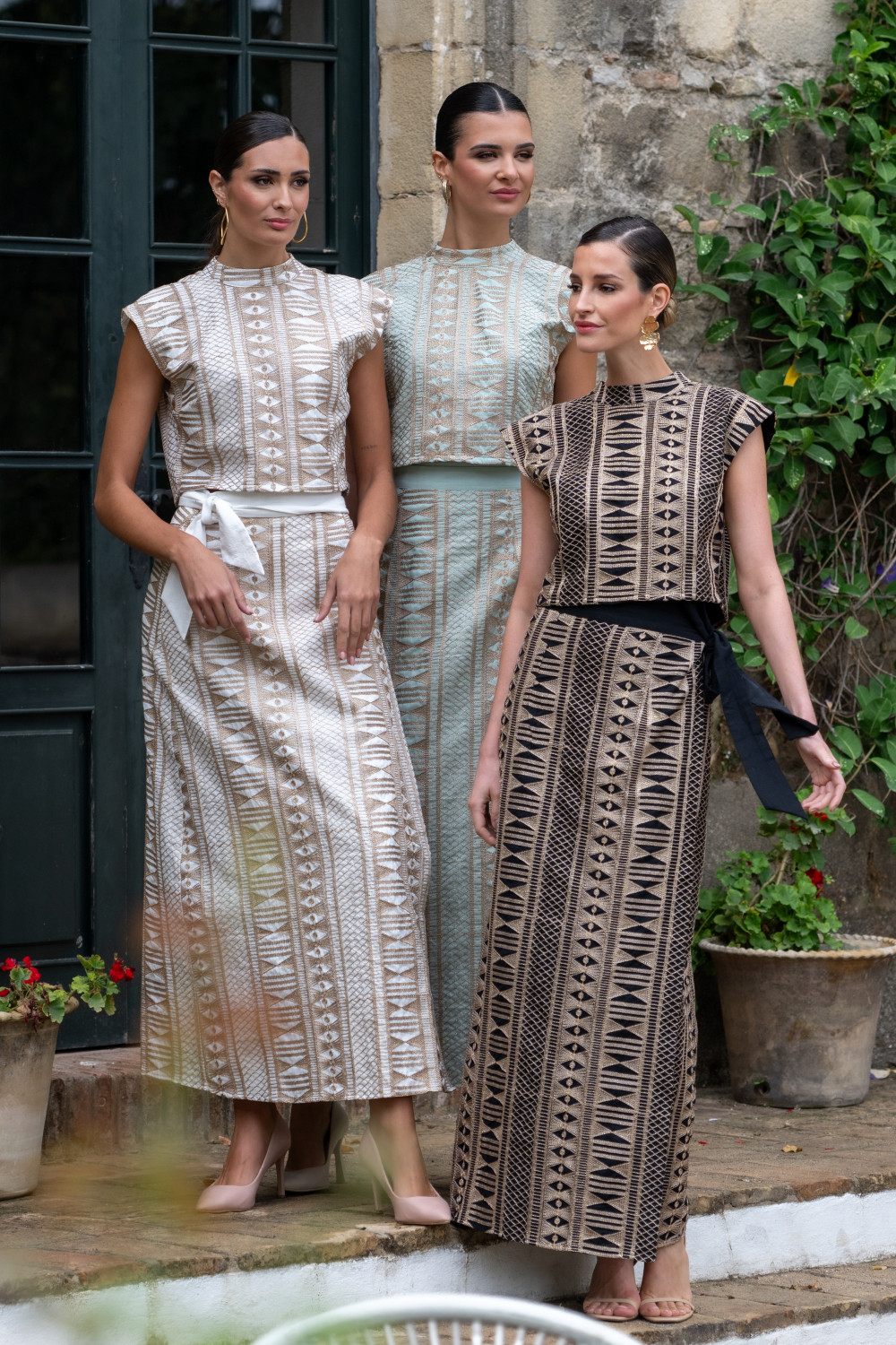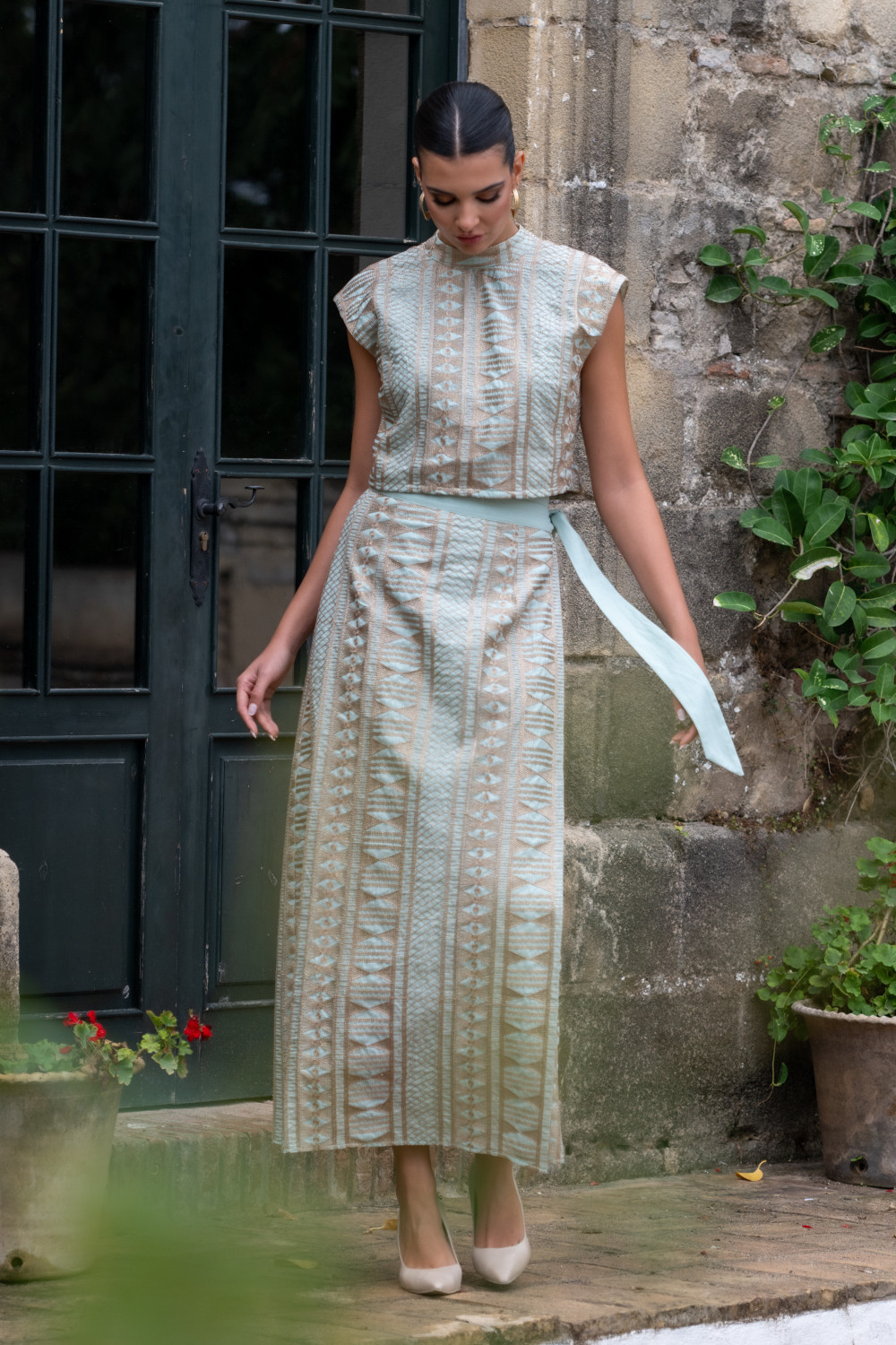Top aqua abierto por detrás abotonado. Tejido con bordado geométrico en hilo metálico de color bronce.