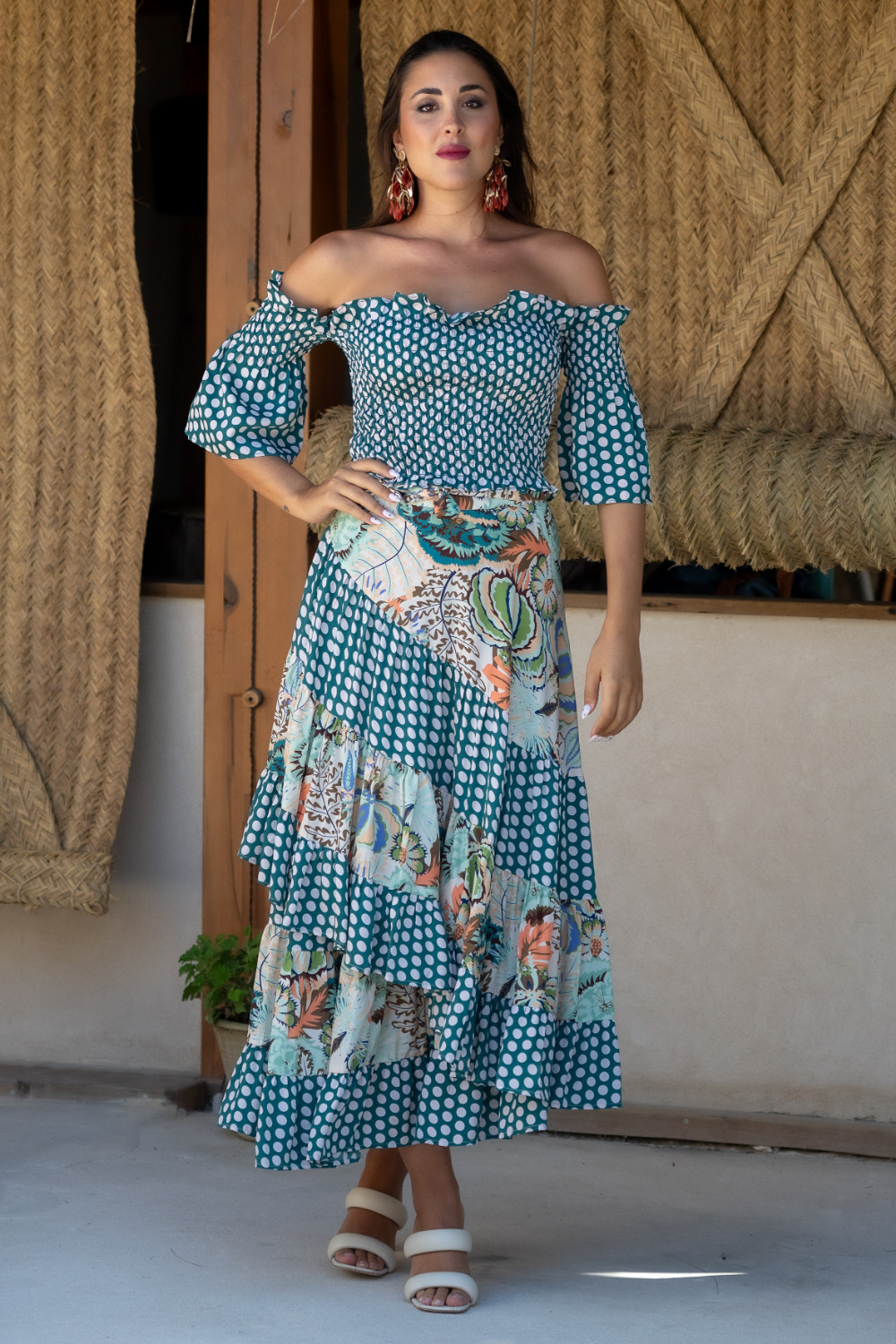 Vestido camisero con cuellos, punos y botonadura central con cinturon independiente y estampados a contraste en polisilk con estampado botanico en tonos verdes y azulados combinado con lunar blanco sobre verde Sunset...