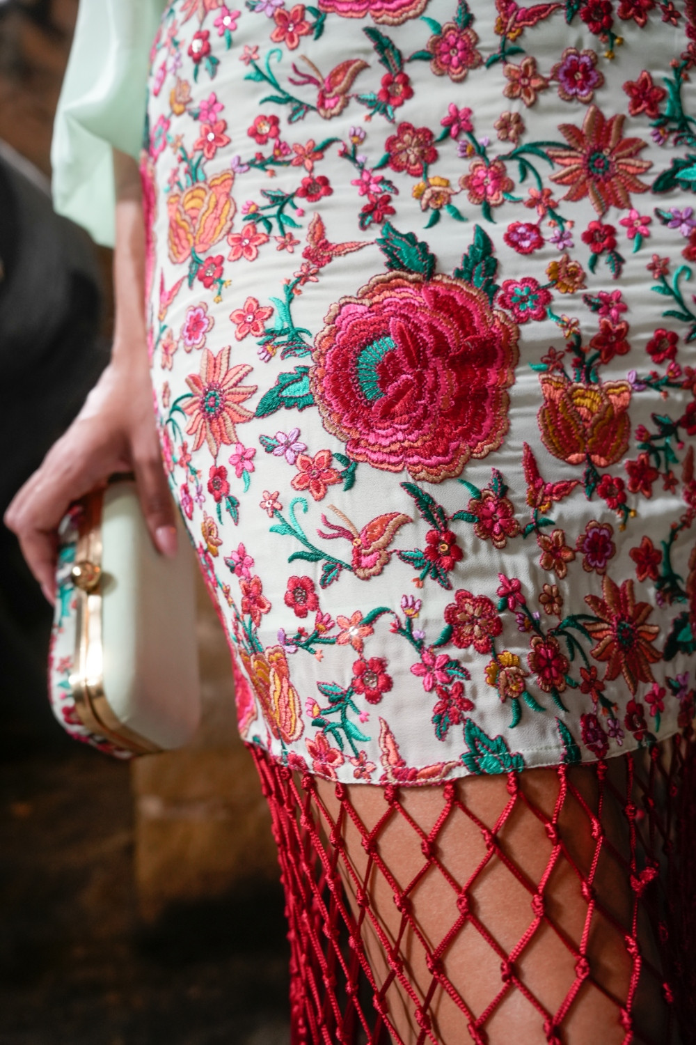 Falda Feria verde de tejido de gasa bordado con flores en tonos rojo, fucsia y coral terminada en flecos rojos Káhyra.