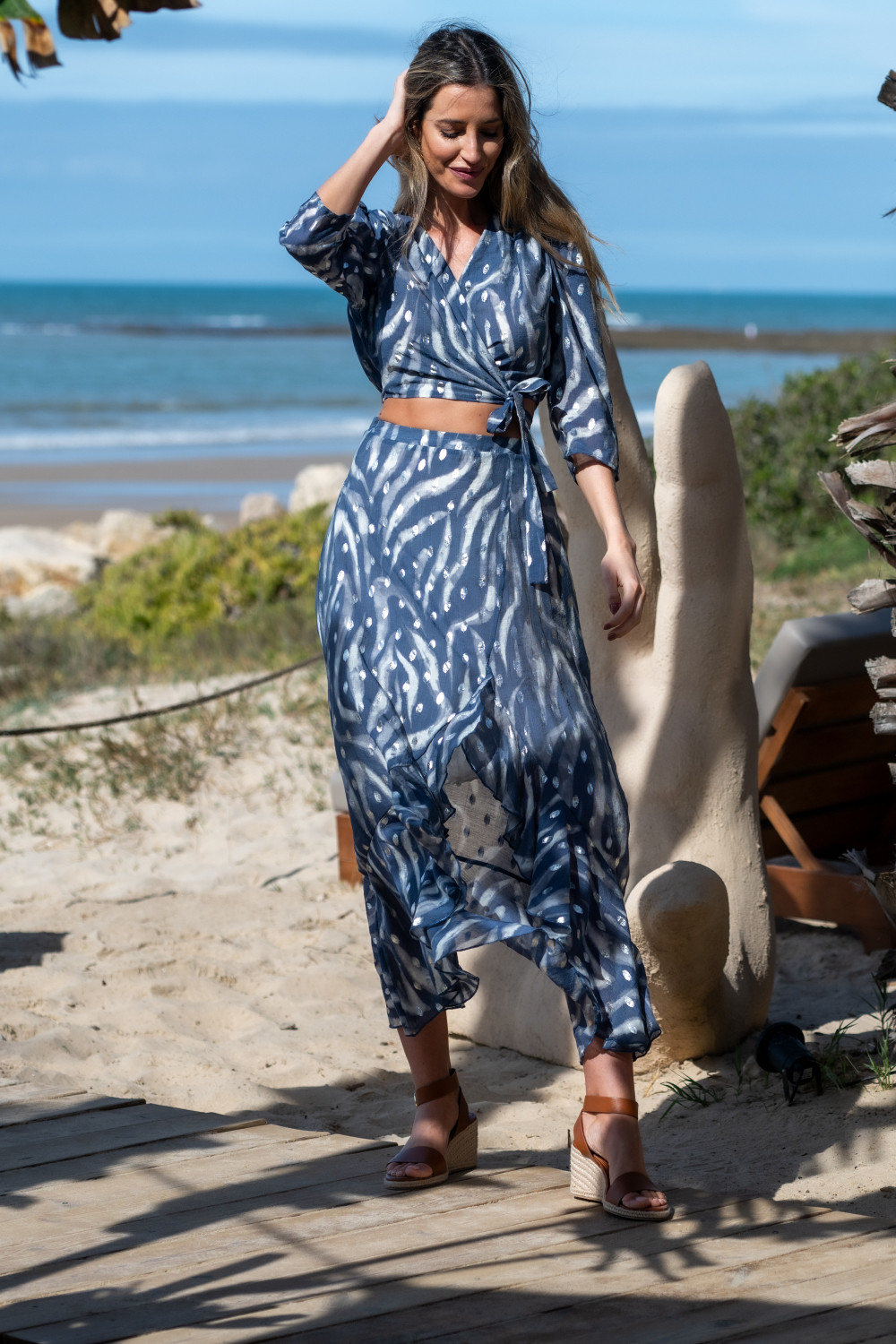 Falda cruzada con volante con estampado animal print en tonos azul y detalles plata Sunset Moon. Calidad: 70% Rayon 30%Polyamide - Forro: 100% Poliéster