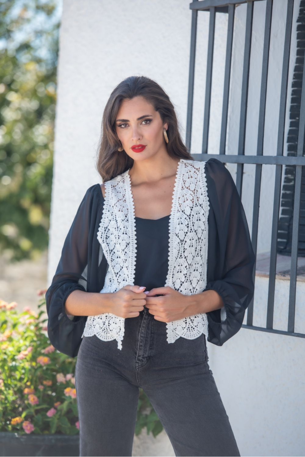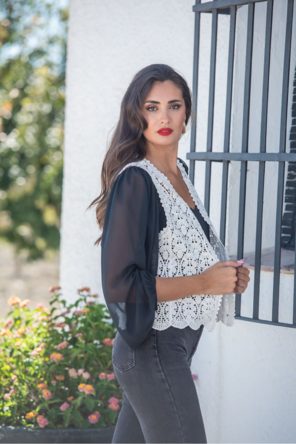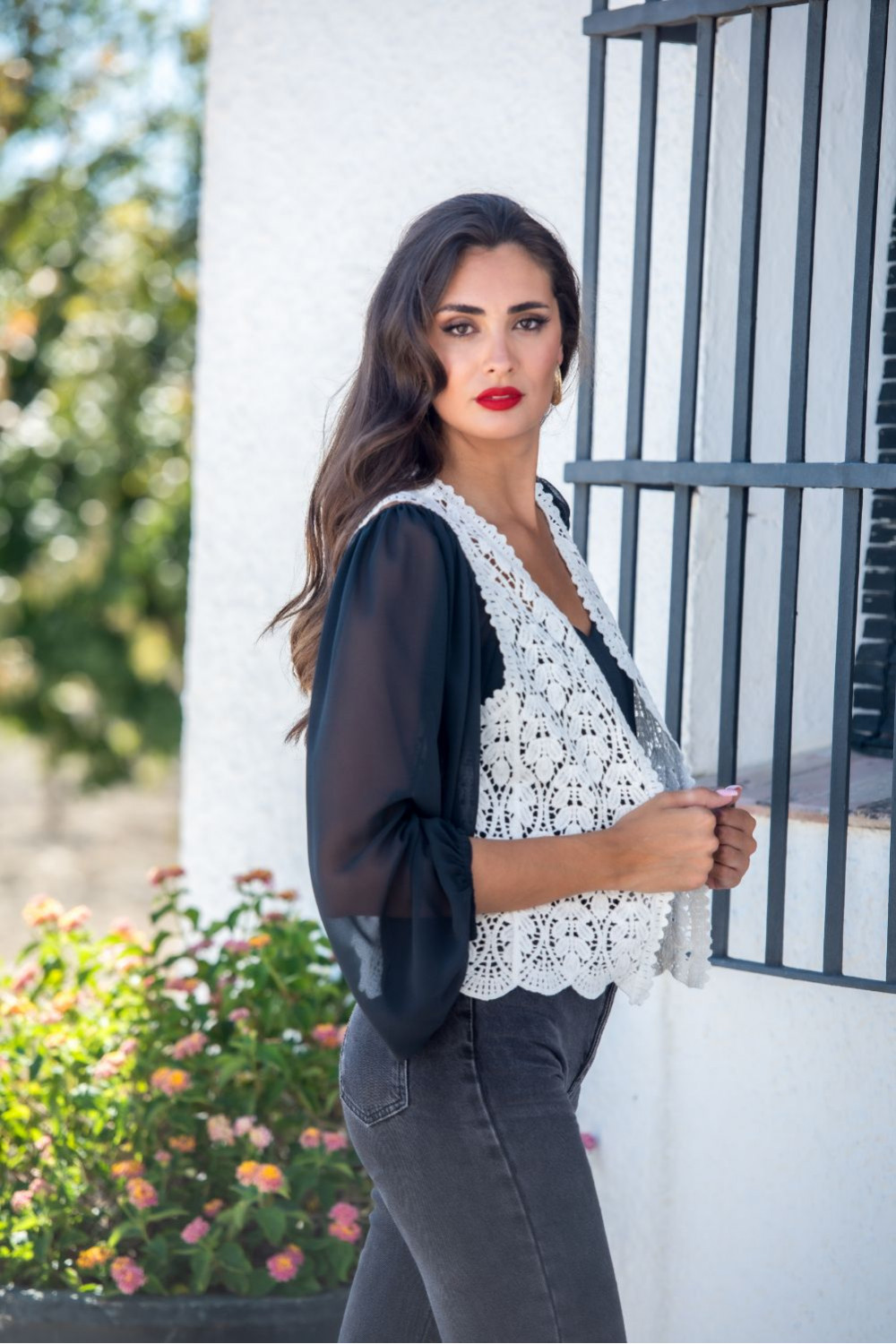 Chaleco largo bolonia blanco croché hojas.