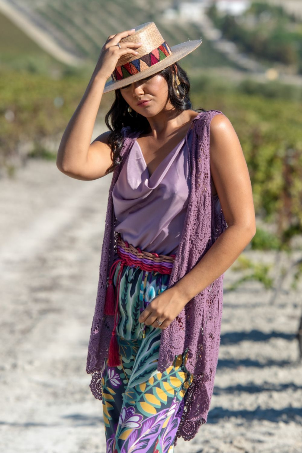 Chaleco corto meca lila croché motivos árabes.