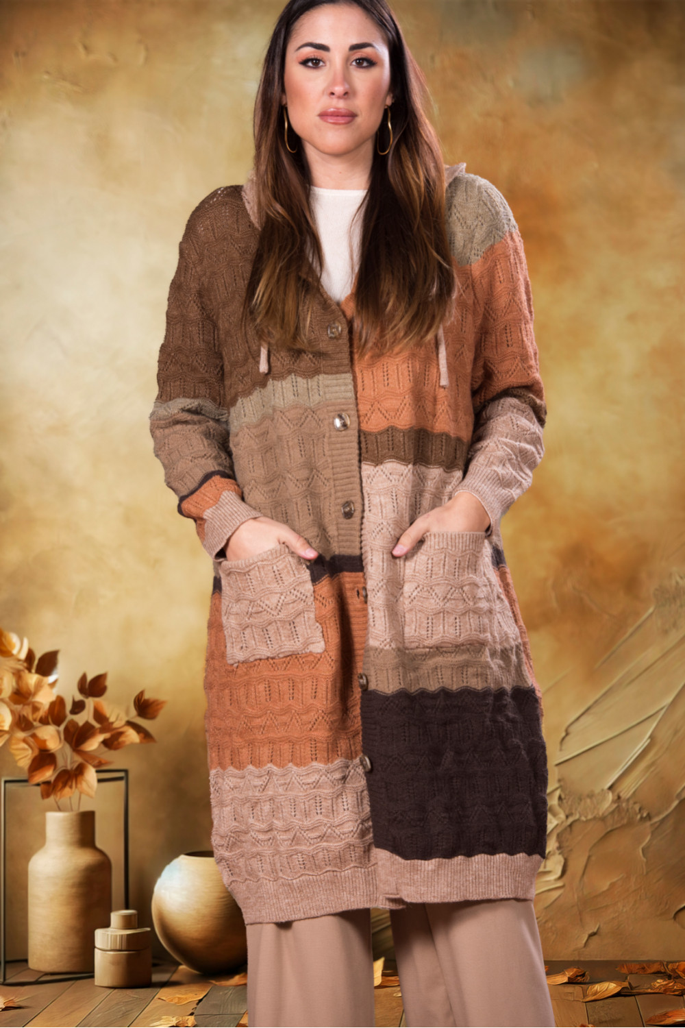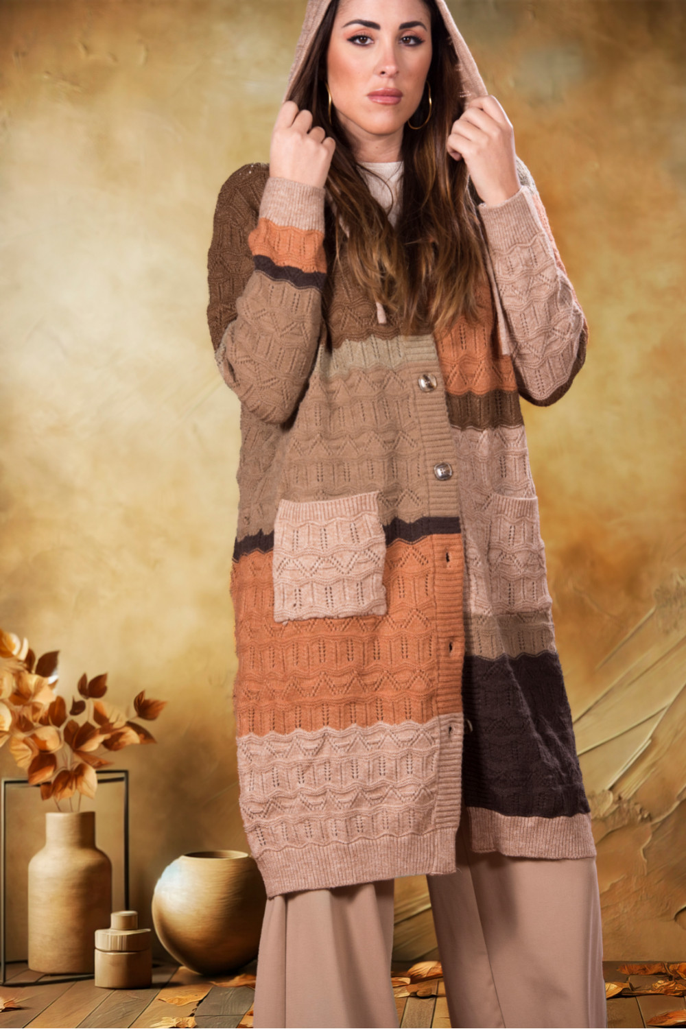 Jersey trenca larga con cuadros naranja, marrón y camel con botones y dos bolsillos además lleva capucha.