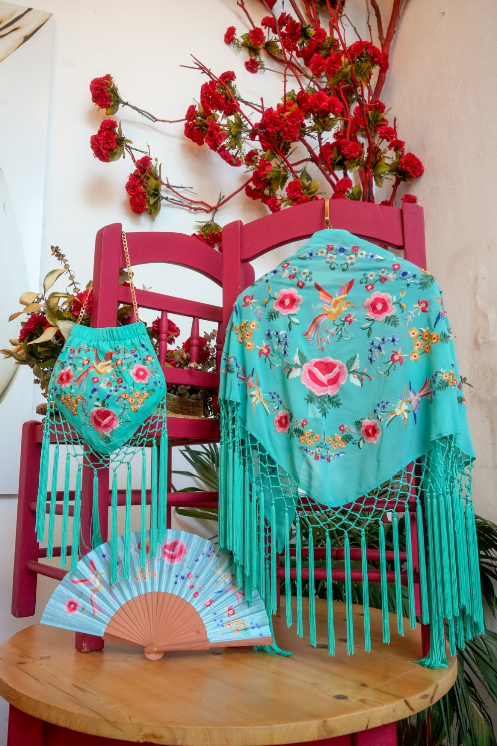 Mantón Dalia aqua con flores y pajaro con plumas de colores Káhyra