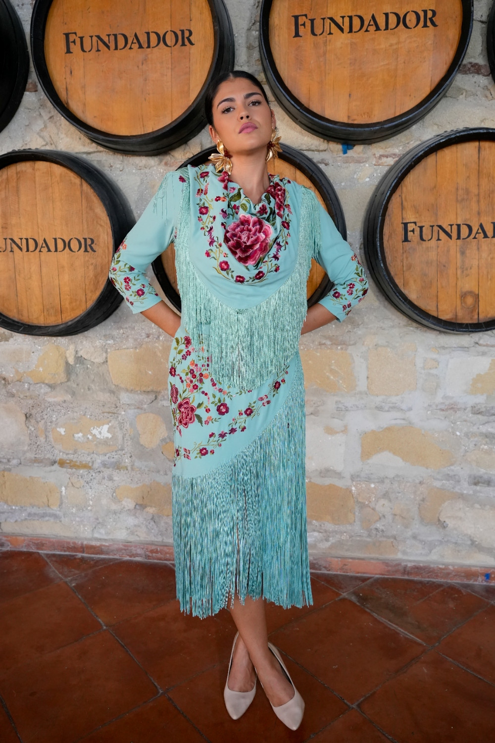 Mantón Suspiro aqua bordados de flores sutil en tonos rojo. coral y rosa con flecos al tono Káhyra
