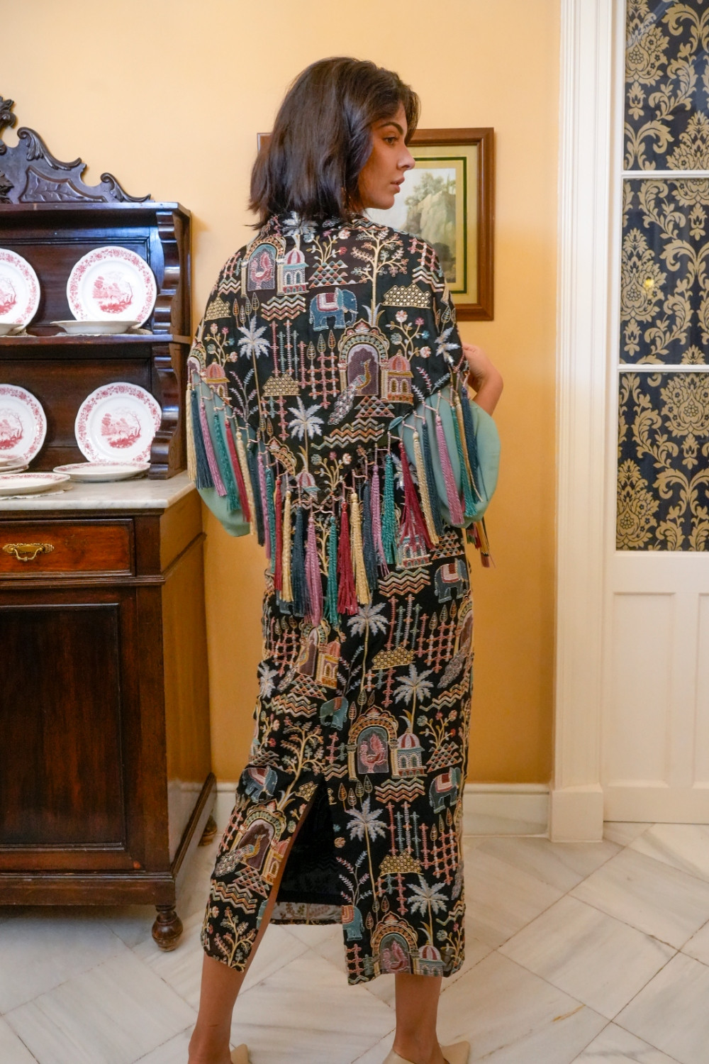 Mantón india negro de tejido especial bordado con motivos indios. elefantes. pavos reales. templetes y flecos negros Kahyra