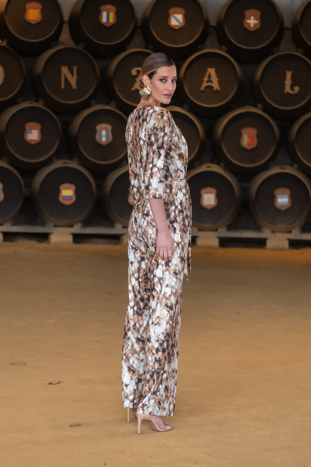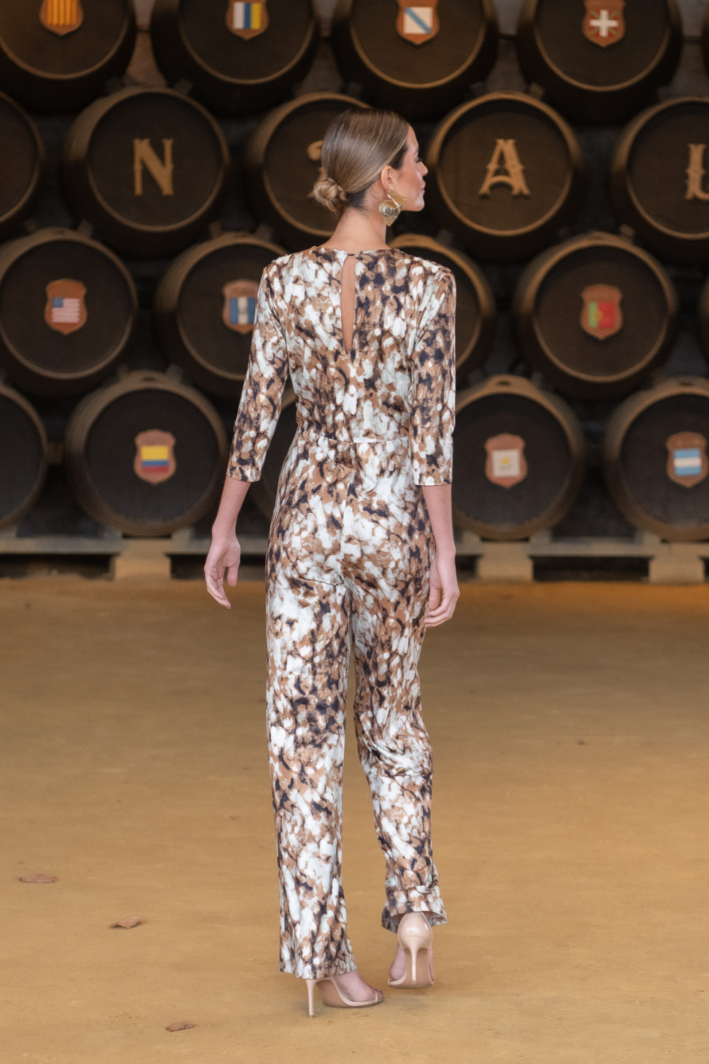 Mono de punto de seda con licra en estampado animal print colores verde aqua y marrones, escote de pico y nudo en cintura.