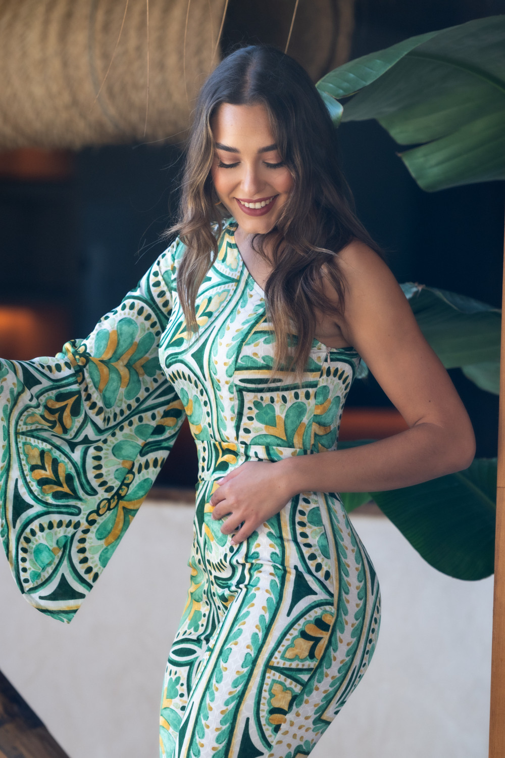 Mono asimetrico con una manga larga acampanada con estampado mosaico en tonos verdes Sunset & Moon.