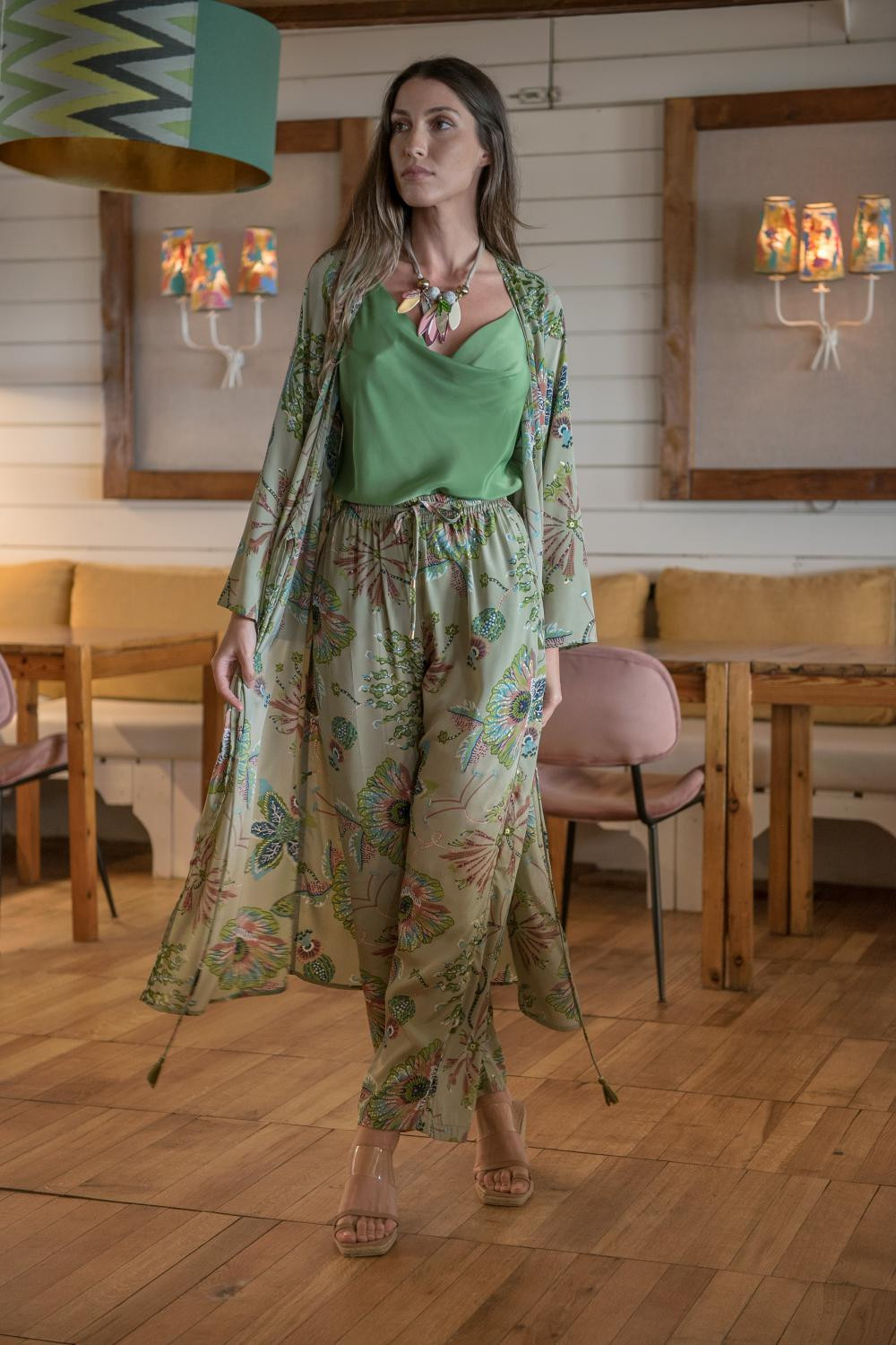 Vestido estampado Jardín Japo verde , cruzado escote pico remangado en cintura con volante al filo, y volante en la manga al codoCOMPOSICIÓN: 100% VISCOSA