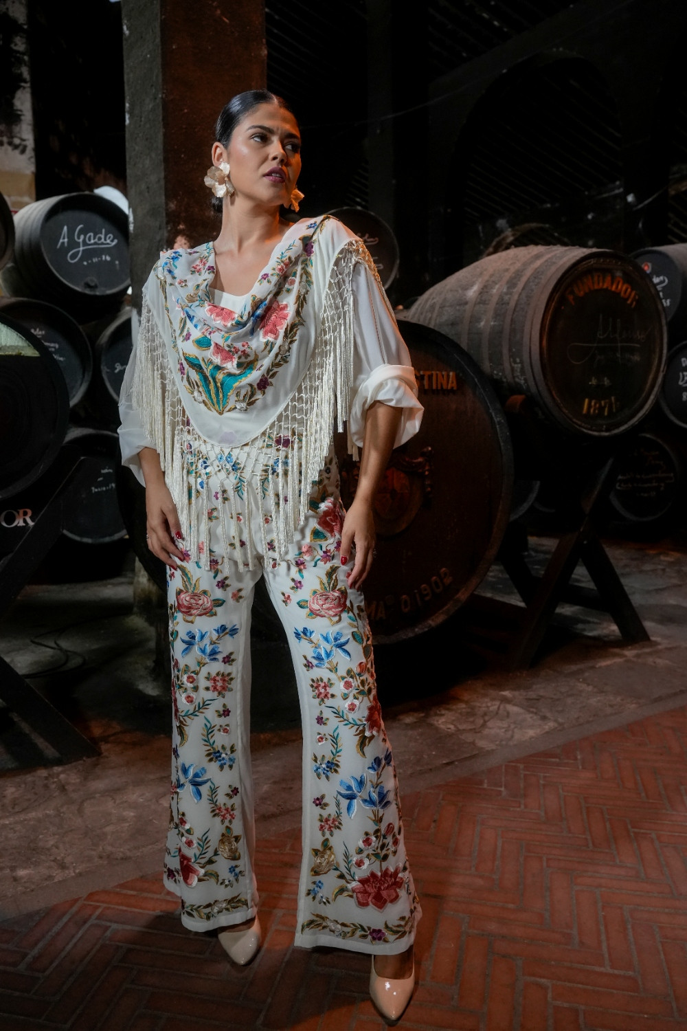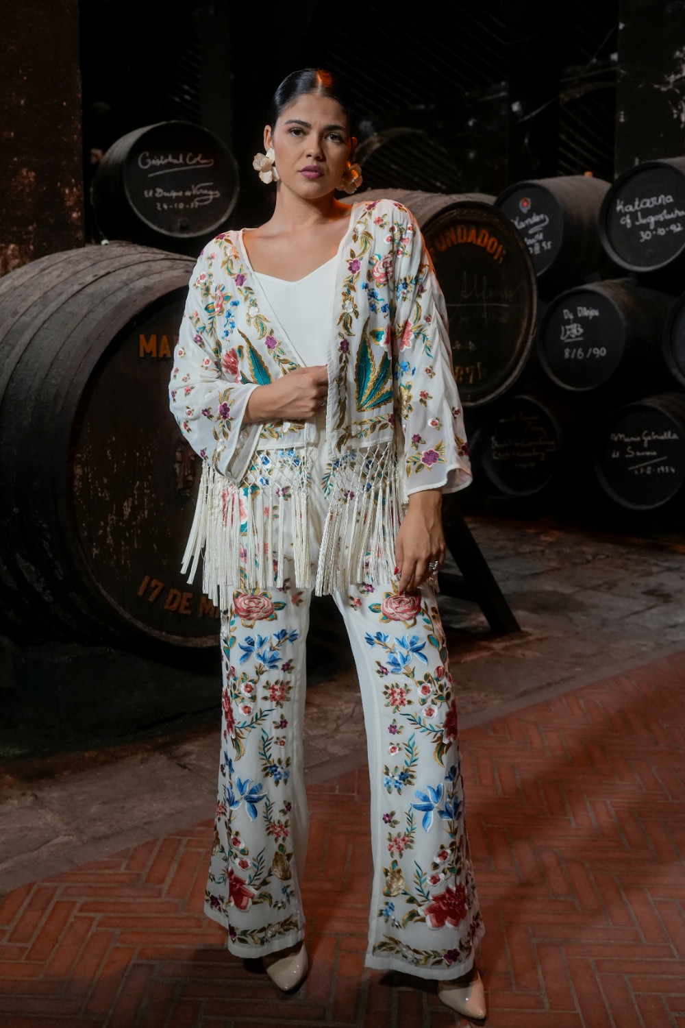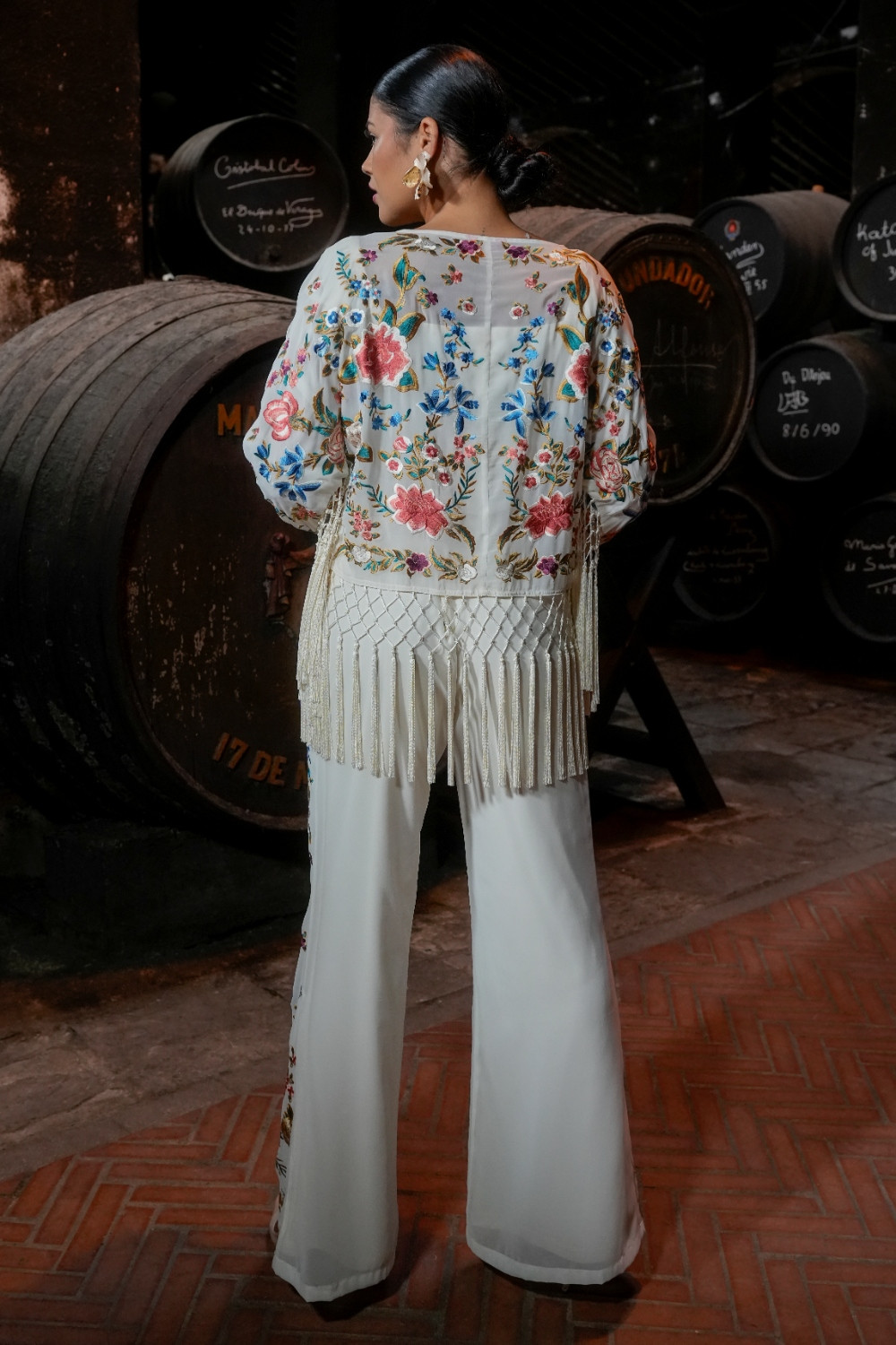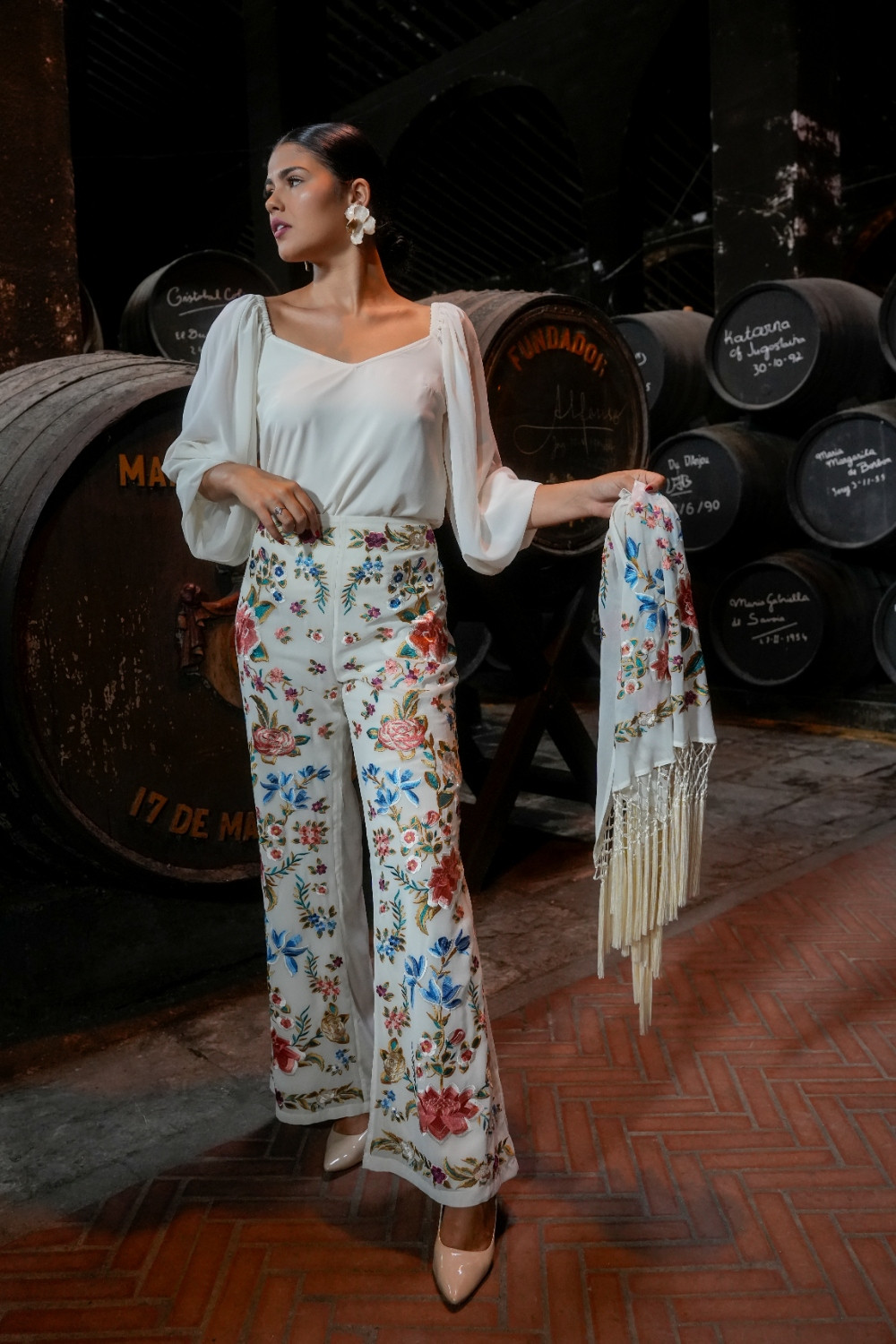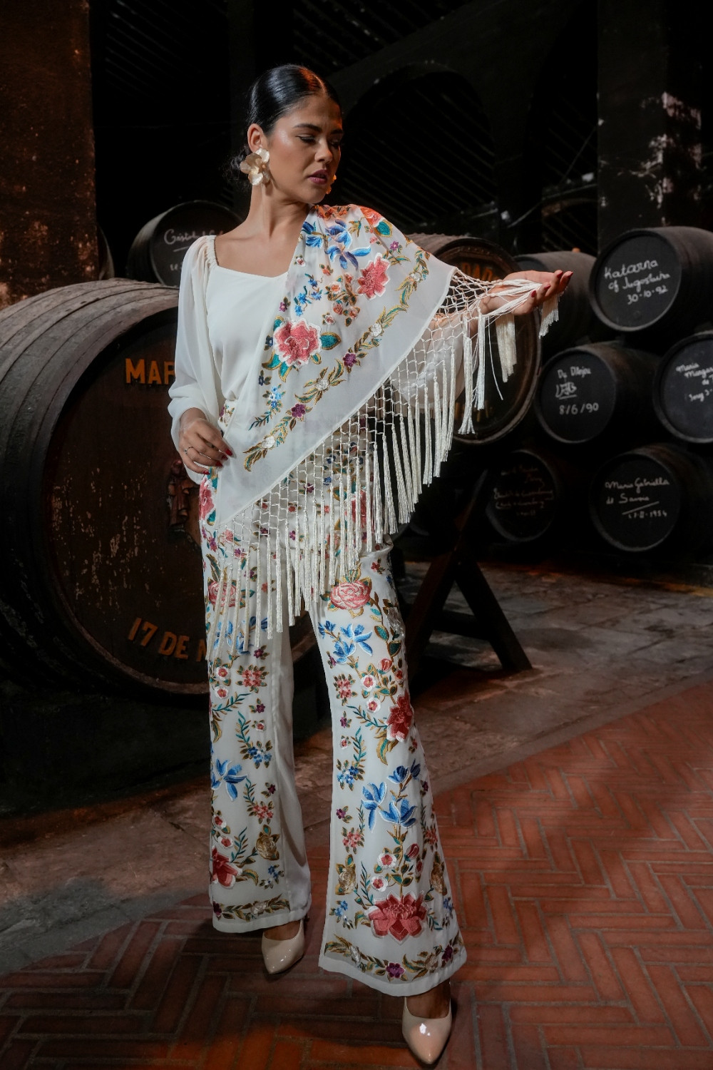 Pantalón Valle marfil de gasa bordado de mantón con motivos florales káhyra.