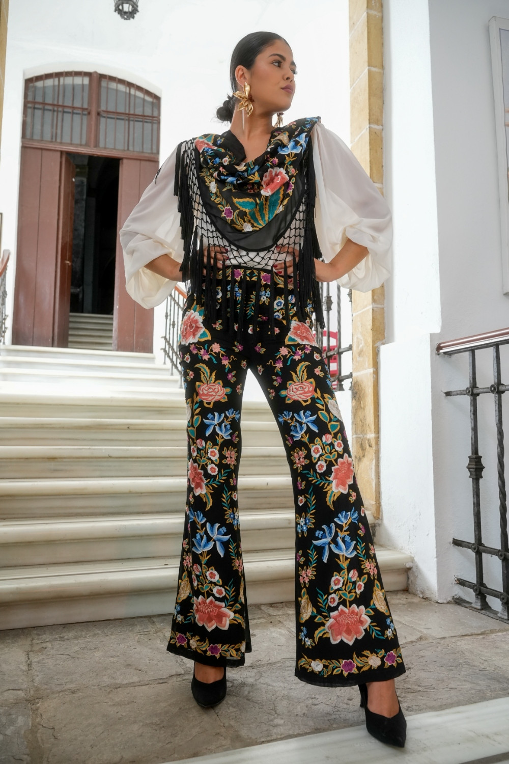 Pantalón Valle negro de gasa bordado de mantón con motivos florales Káhyra. COMPOSICIÓN: 100% POLIÉSTER FORRO: 100% POLIÉSTER