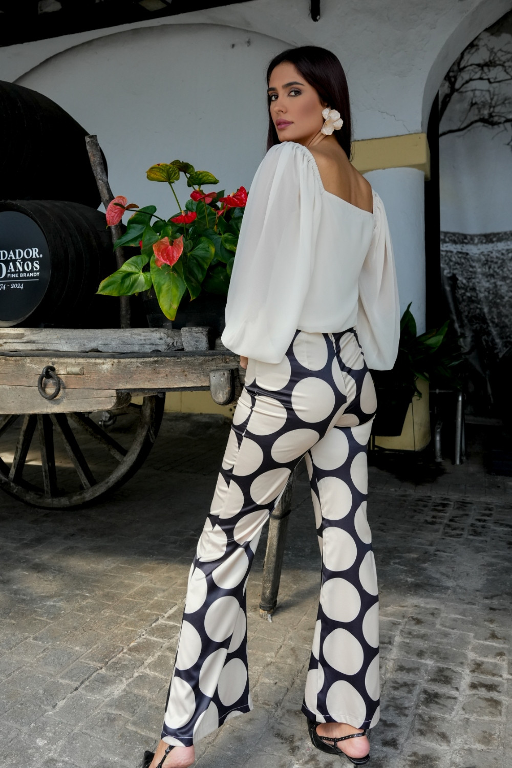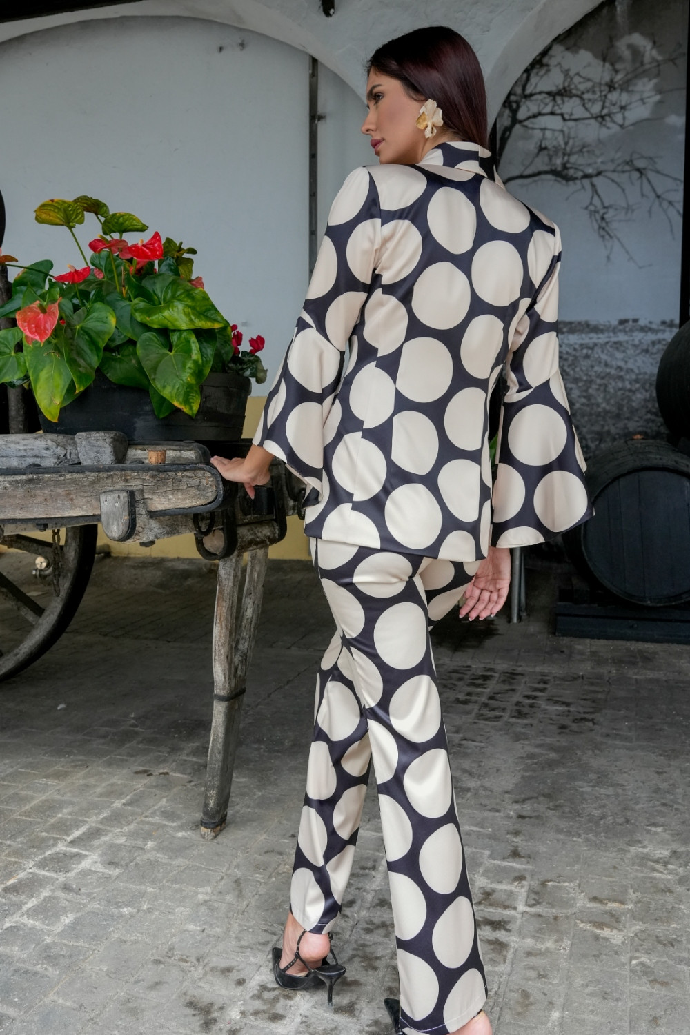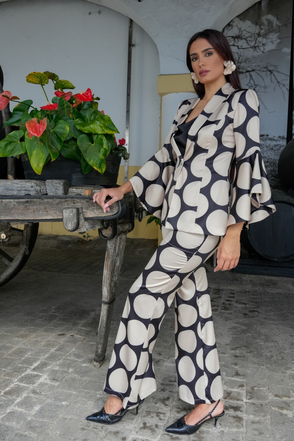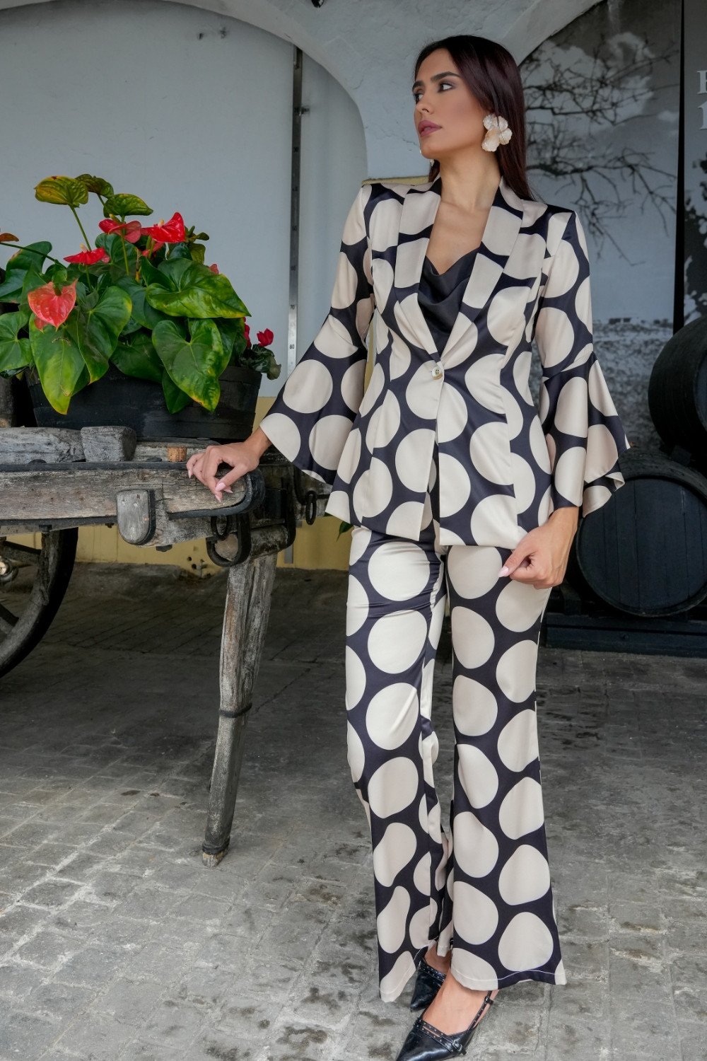 Pantalón Luna de estampado de lunares grande en beige con fondo negro Káyra. COMPOSICIÓN: 97%POLIÉSTER. 3% LICRA