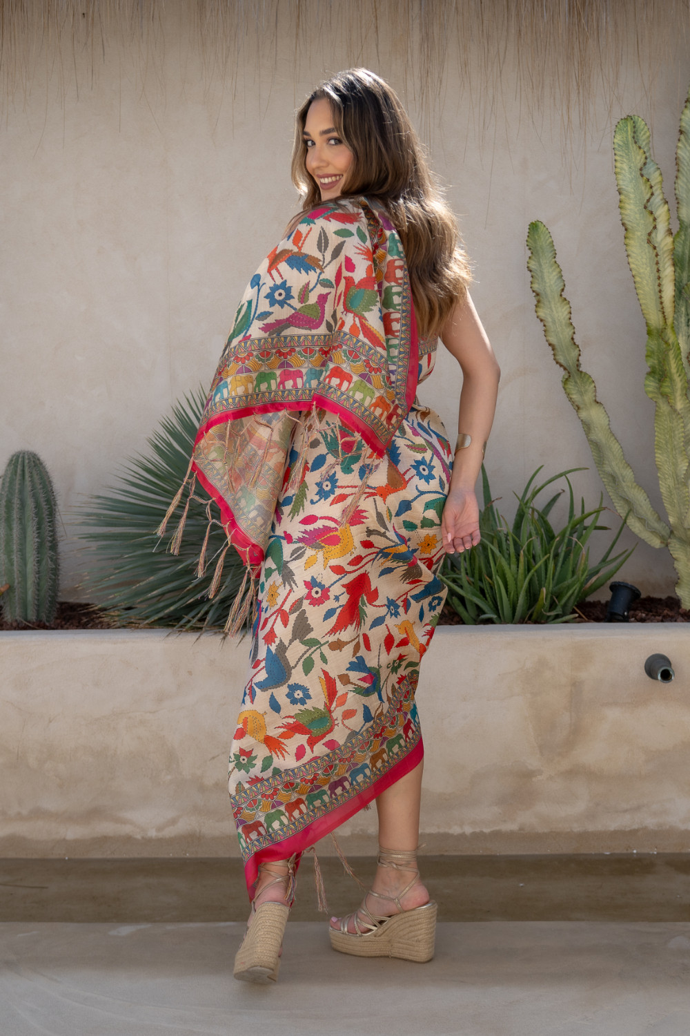 Pareo con flecos hechos con mezcla de seda de assam con estampado floral multicolor sobre marfil Sunset & Moon.