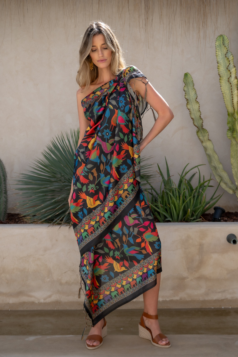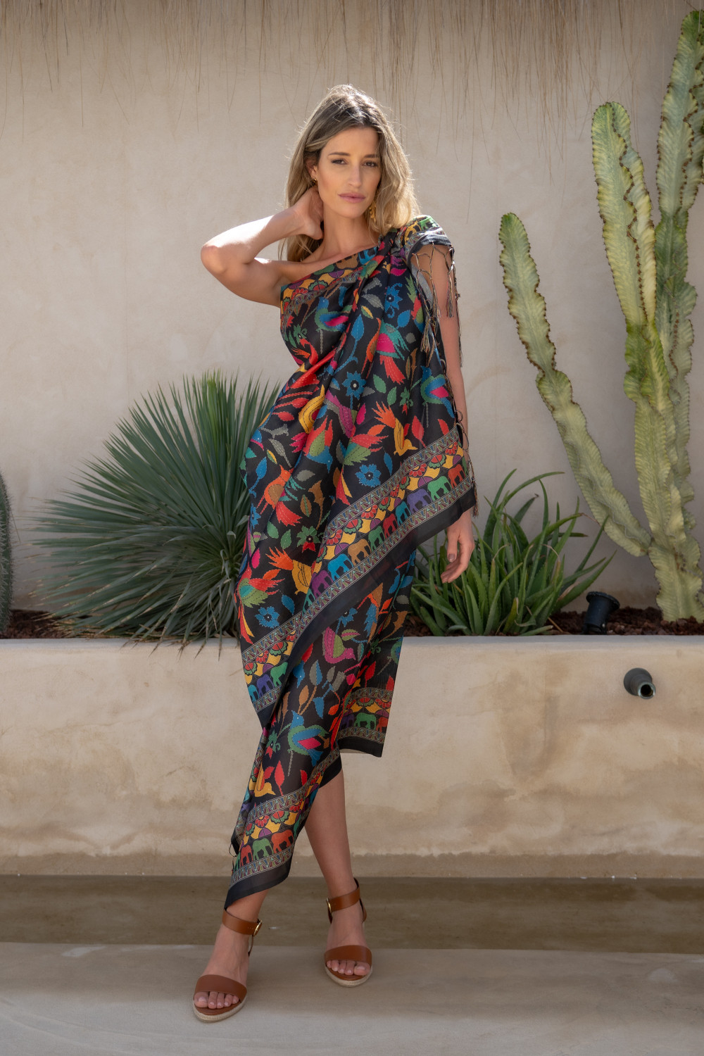 Pareo con flecos hechos con mezcla de seda de assam con estampado floral multicolor sobre negro Sunset & Moon.