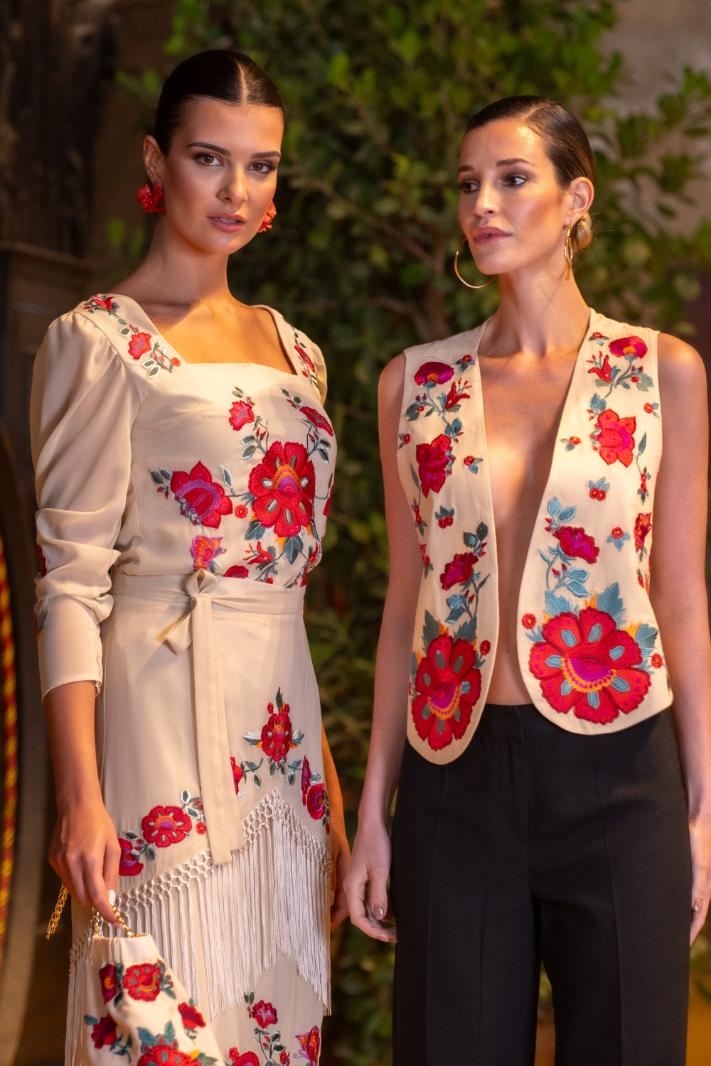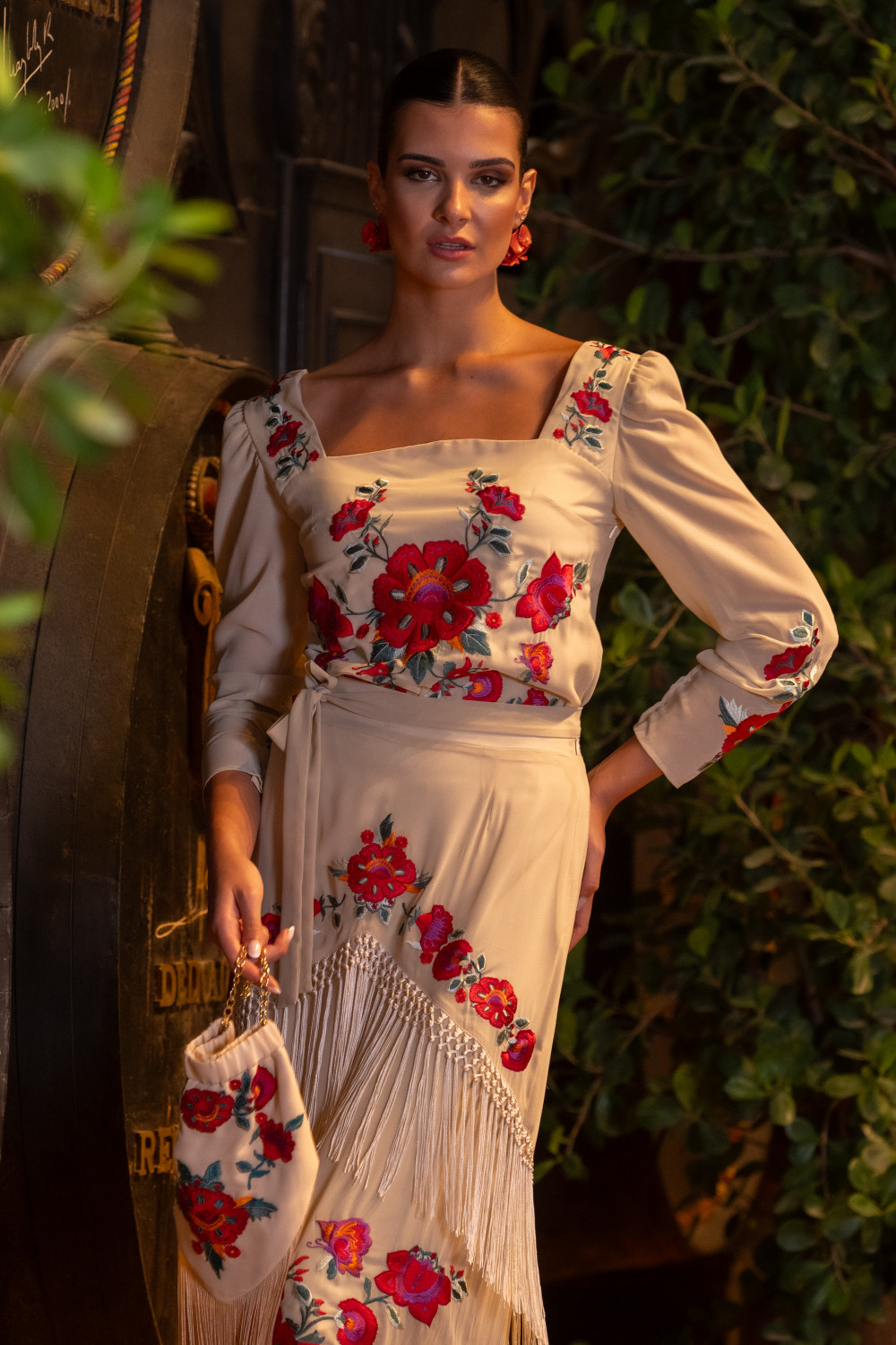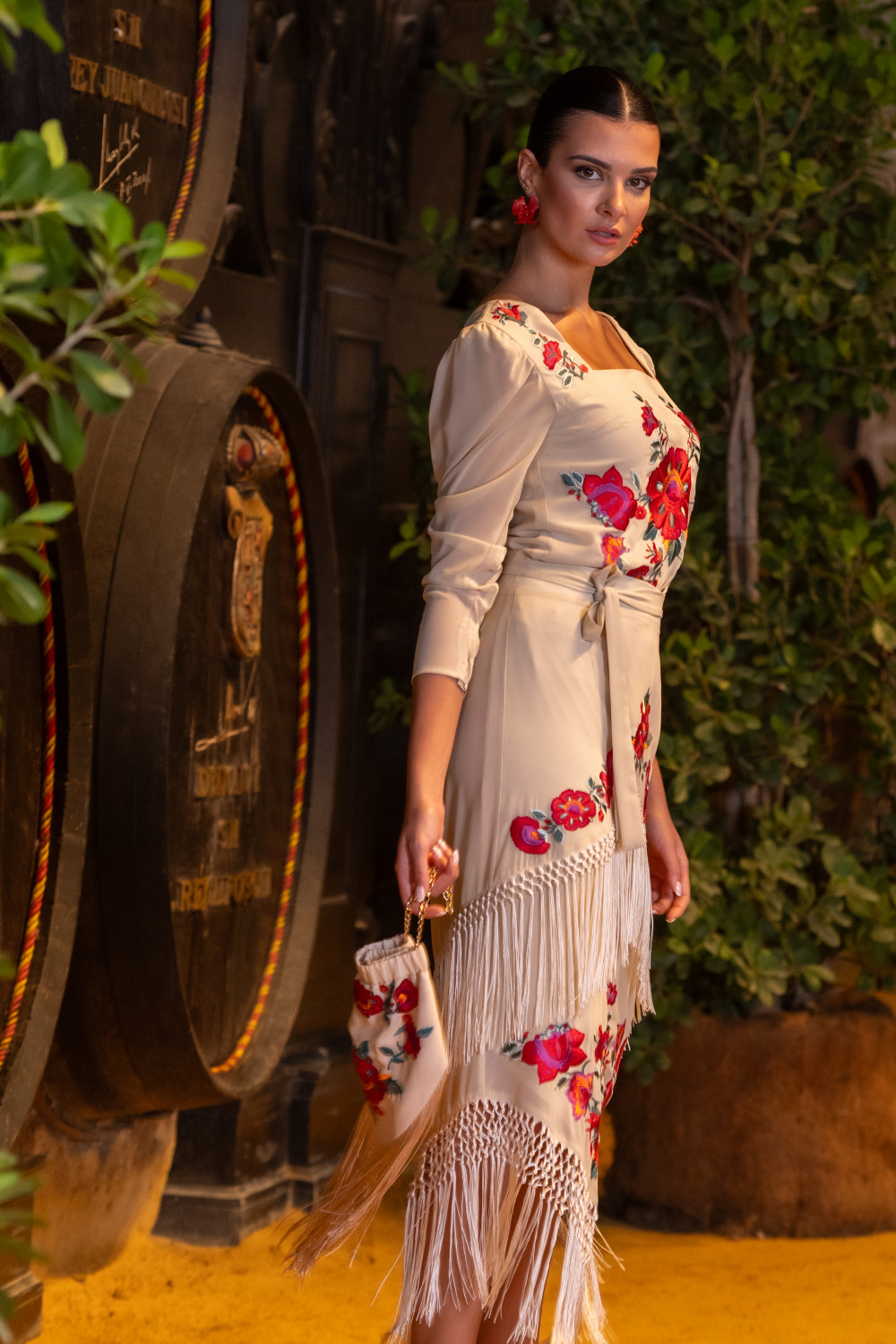 Vestido beige en gasa bordada a tono con filigrana de rosas beige , sin mangas con volante.Calidad: 100% Poliéster - Forro:100% Poliéster punto - Flecos: Viscosa
