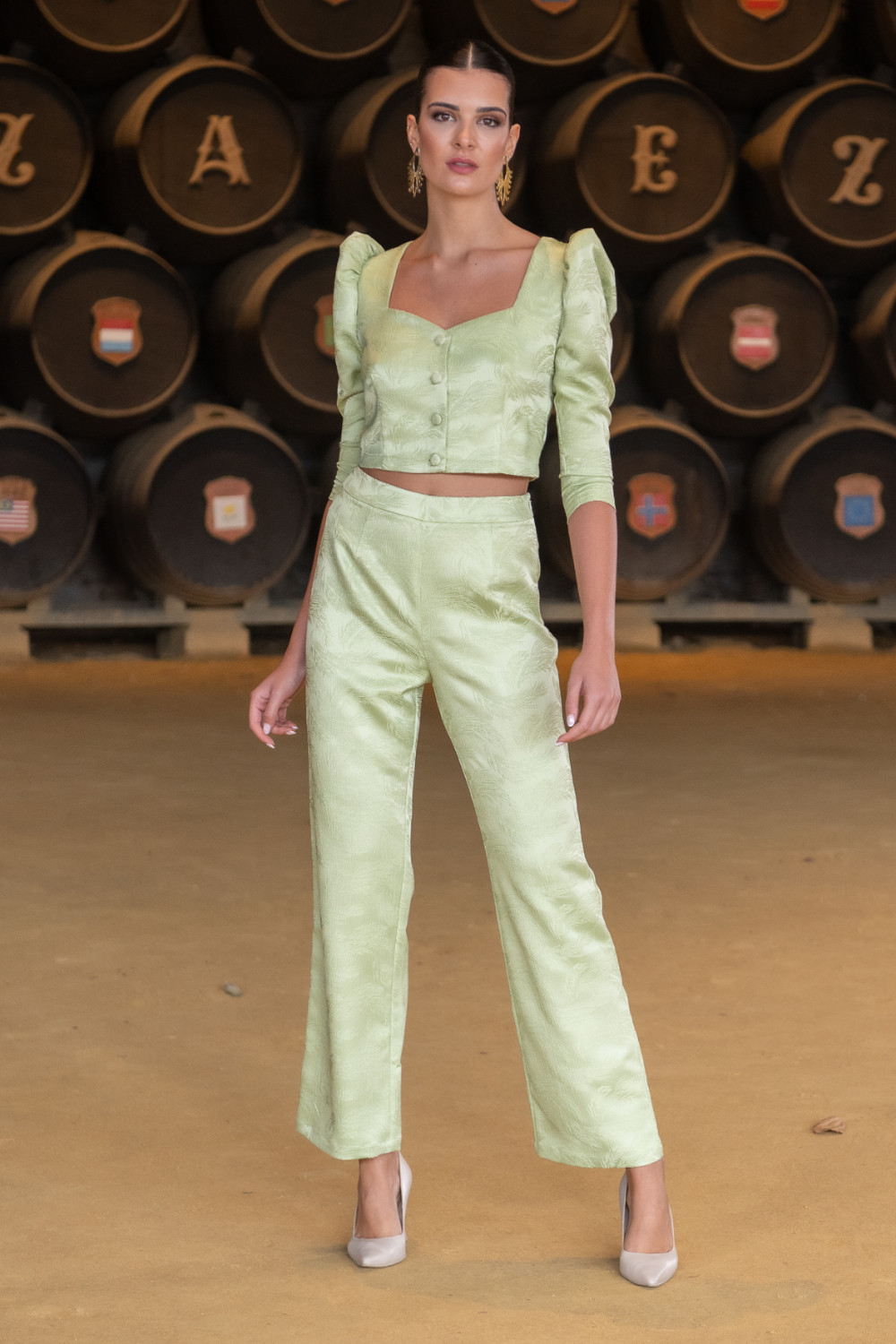 Top verde con Tejido brocado en hojas. abierto abotonado por delante. escote corazón. manga francesa. Calidad: 100% Poliéster