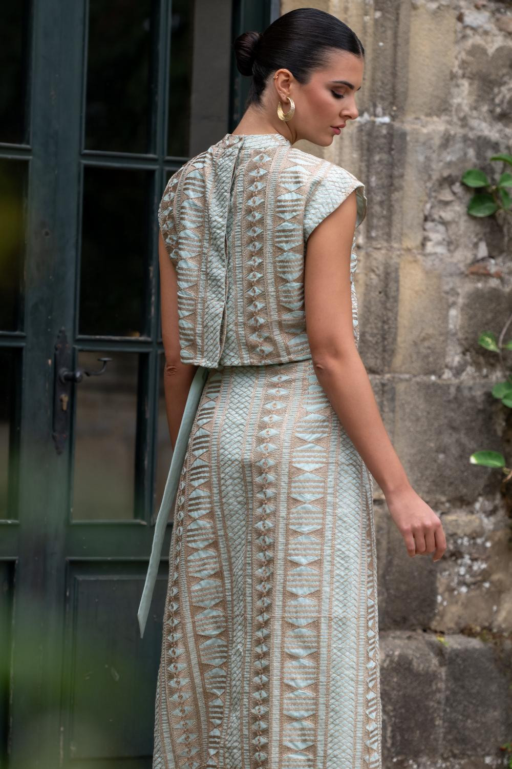 Top aqua abierto por detrás abotonado. Tejido con bordado geométrico en hilo metálico de color bronce. Calidad: 50% Algodón 50% Poliéster - Forro: 80% Poliéste 20%Algodón