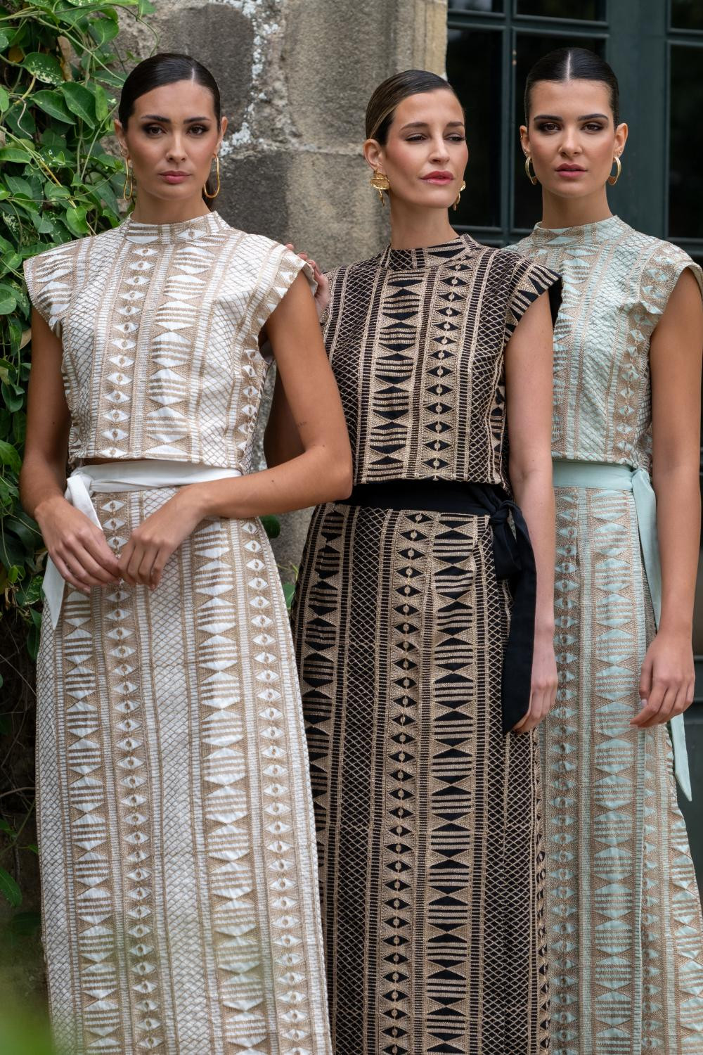 Top beige abierto por detrás abotonado. Tejido con bordado geométrico en hilo metálico de color bronce. Calidad: 50% Algodón 50% Poliéster - Forro: 80% Poliéste 20%Algodón