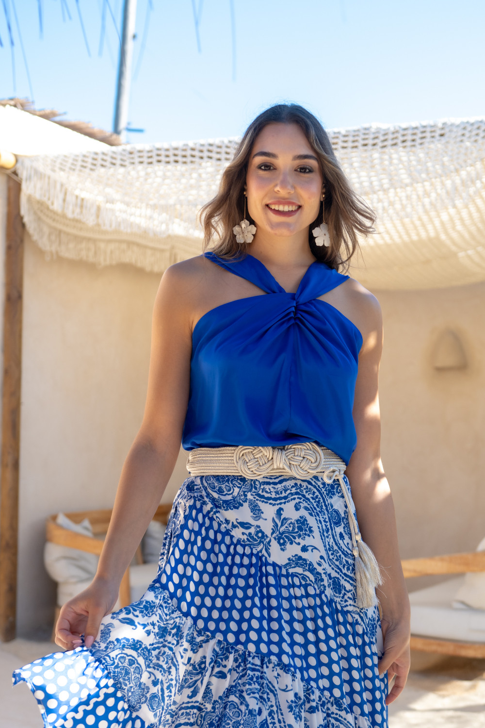 Falda Pareo con volantes superpuestos en polisilk combinando lunares y paisley en tonos azules Sunset & Moon.Calidad: 70% Poliéster 30% seda