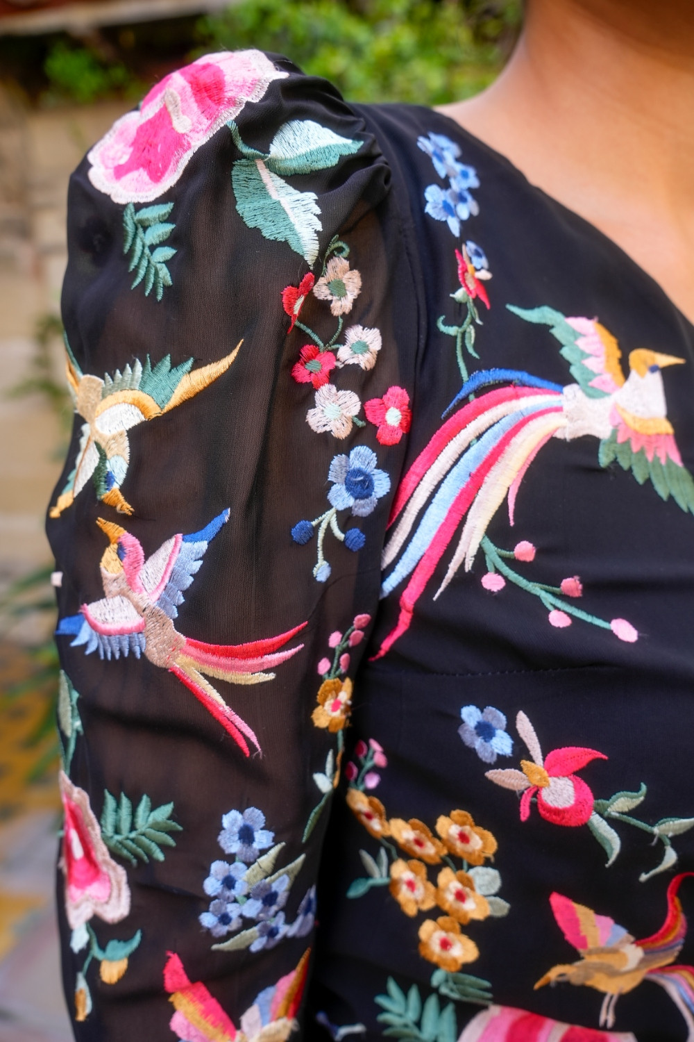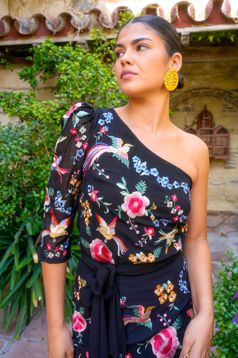 Top Dalia negro de gasa bordada con flores y pajaro de colores asimetrico de una manga Káhyra.
