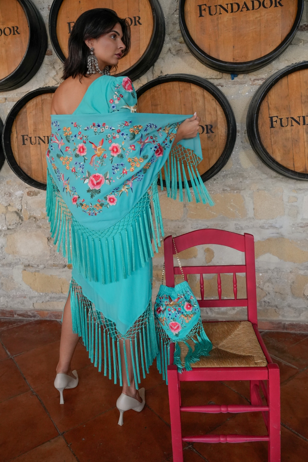 Top Dalia aqua de gasa bordada con flores y pajaro de colores asimetrico de una manga Káhyra.
