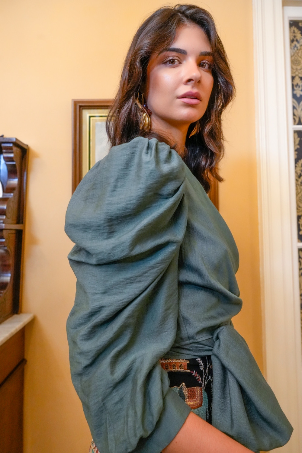 Top Dulzura azul cruzado anudado con fajin ancho a la cintura. manga francesa globo fruncida y fajin Káhyra. COMPOSICIÓN: 80%VISCOSA.20%POLIÉSTER