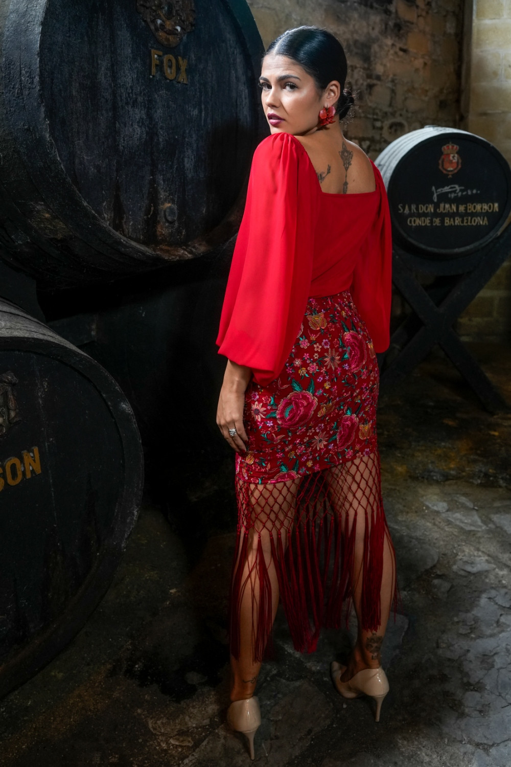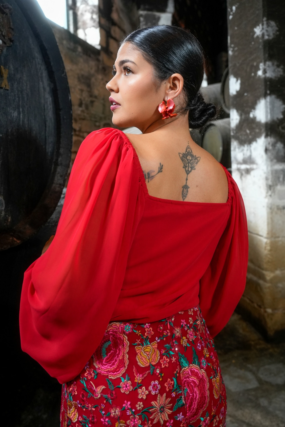 Top Destino rojo liso gasa con escote corazón y mangas abullonadas Káhyra. COMPOSICIÓN: 100% POLIÉSTER FORRO: 100% POLIÉSTER