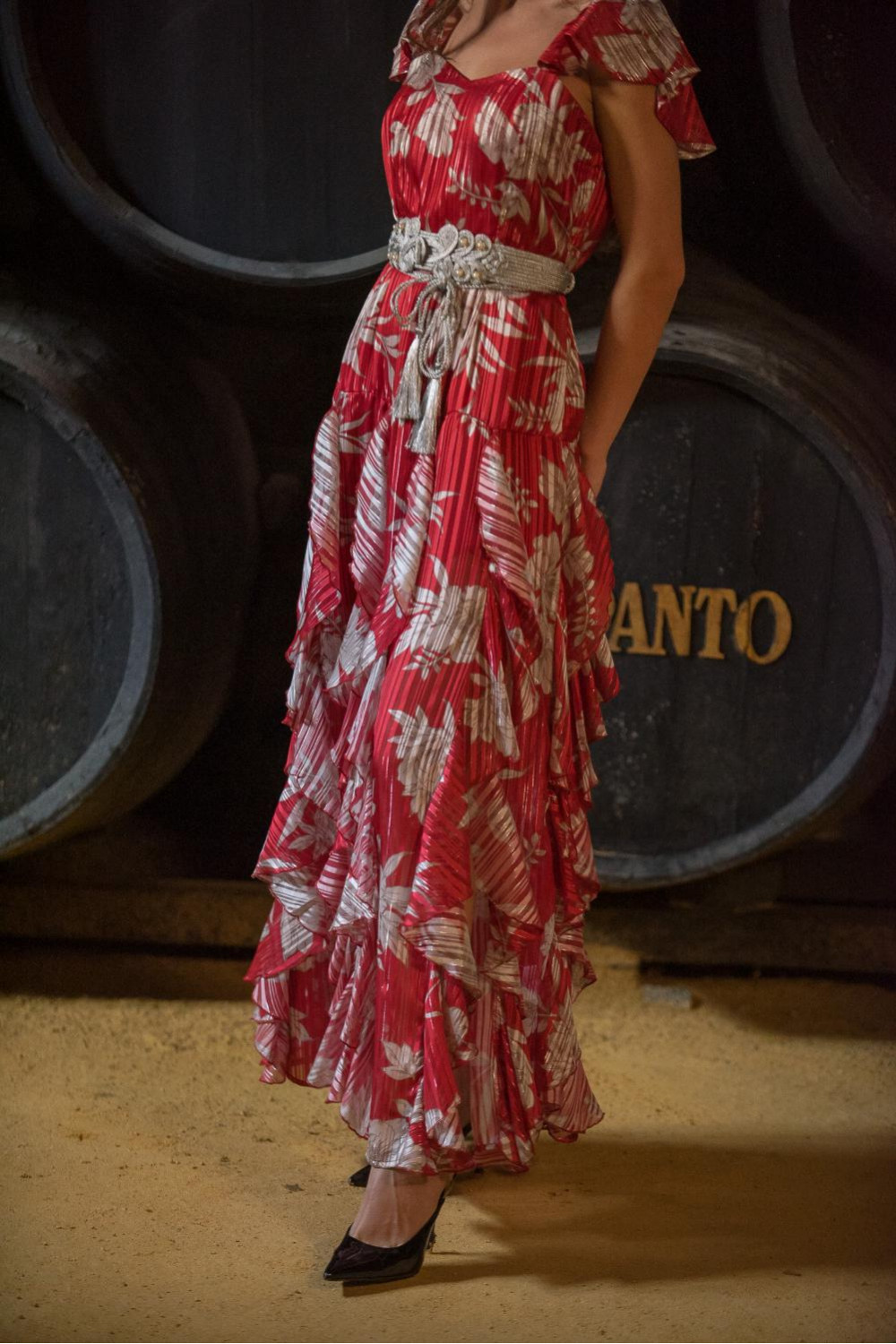 Vestido lardo estamado Rao rojo con flores beige, escote en forma corazón, volantito en tiranta, corte a la cadera con falda de vuelo y volantes verticales