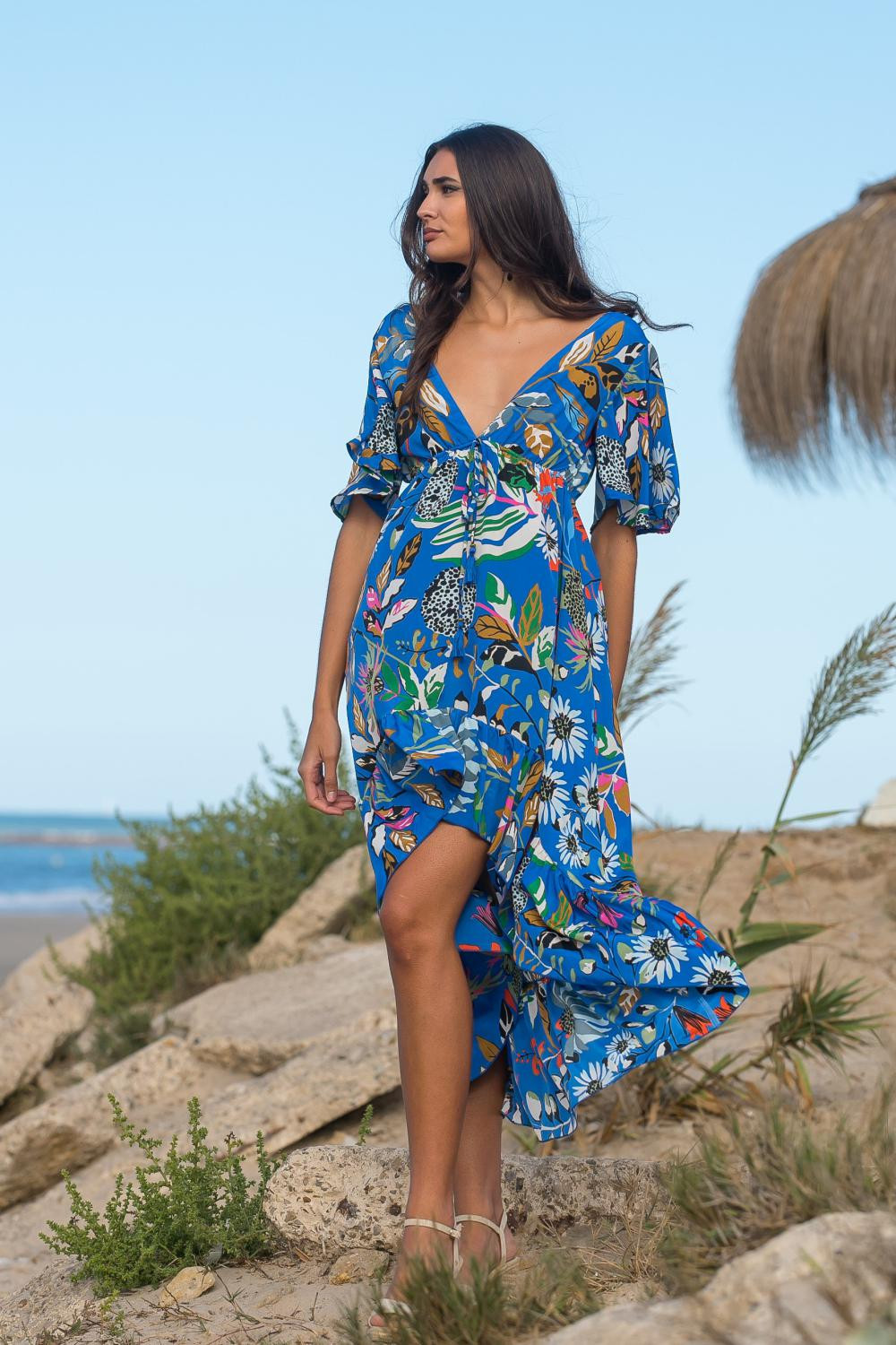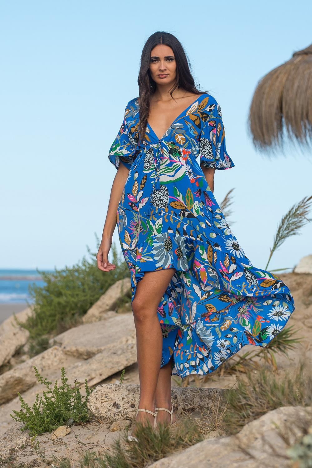 Vestido estampado Azul con flores y margaritas, escote y espalda en pico, cintura fruncida , volante en el bajo, largo desigual más corto por delante