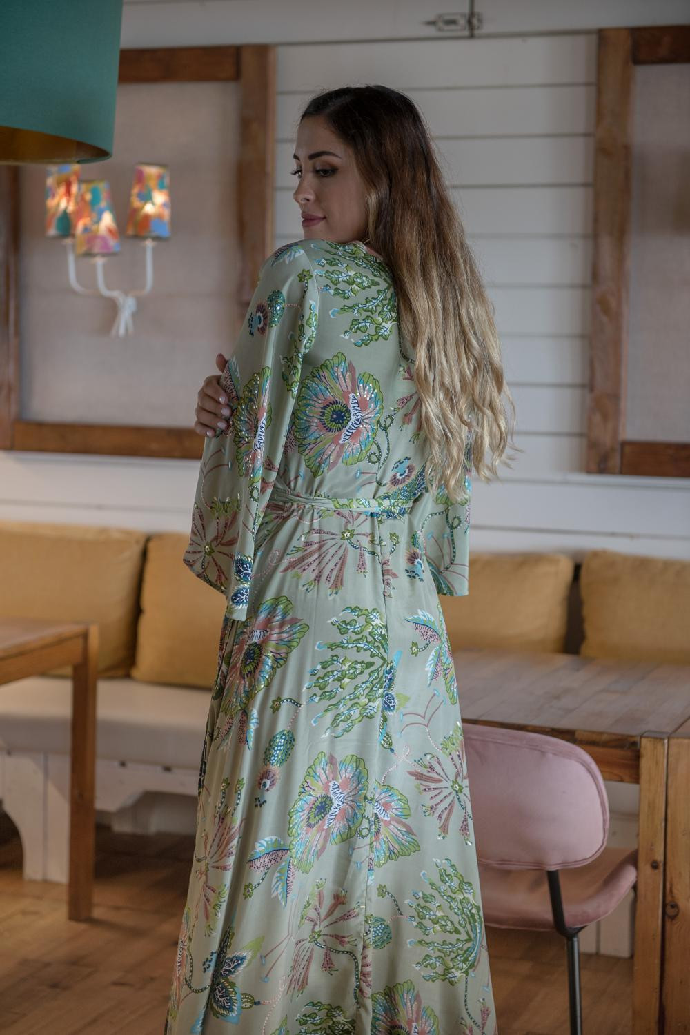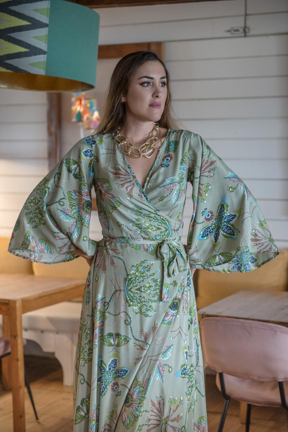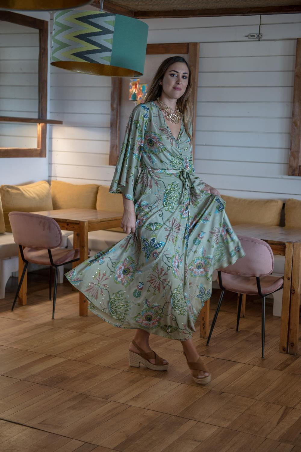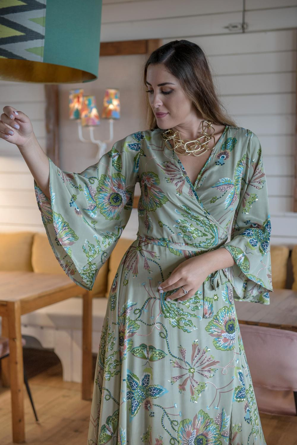 Vestido de satén cruzado con media manga y volante de capa grande en el bajo asimétrico con fondo estampado fondo beige con lunares grandes verde junco, negros y nude.COMPOSICIÓN: 100%POLIESTER