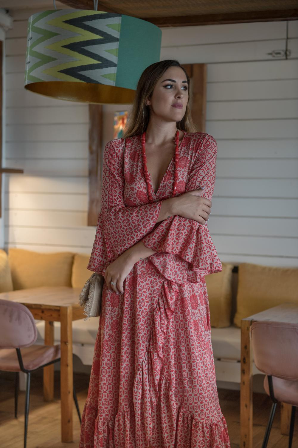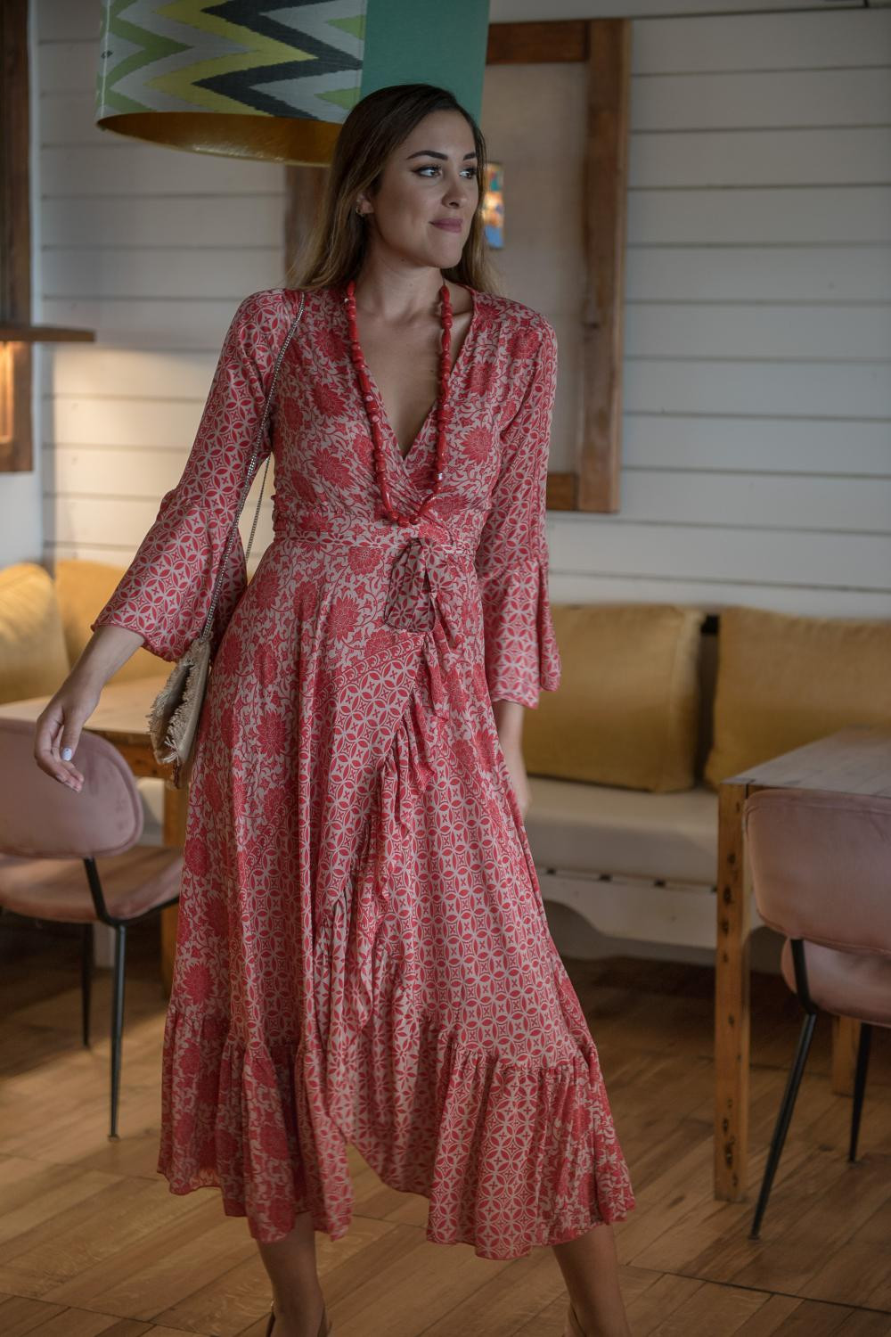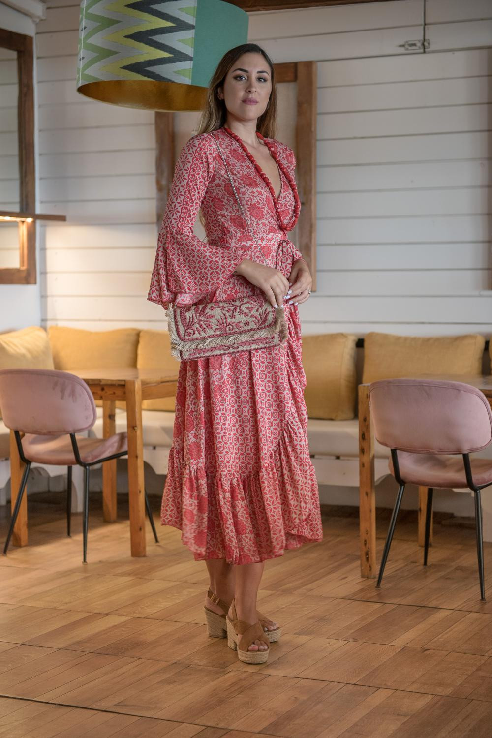 Vestido corto estampado Trenza pastel , cruzado volante en escote y cuello, doble volante en la mangas al codoCOMPOSICIÓN: 70% POLIESTER 30% SEDA