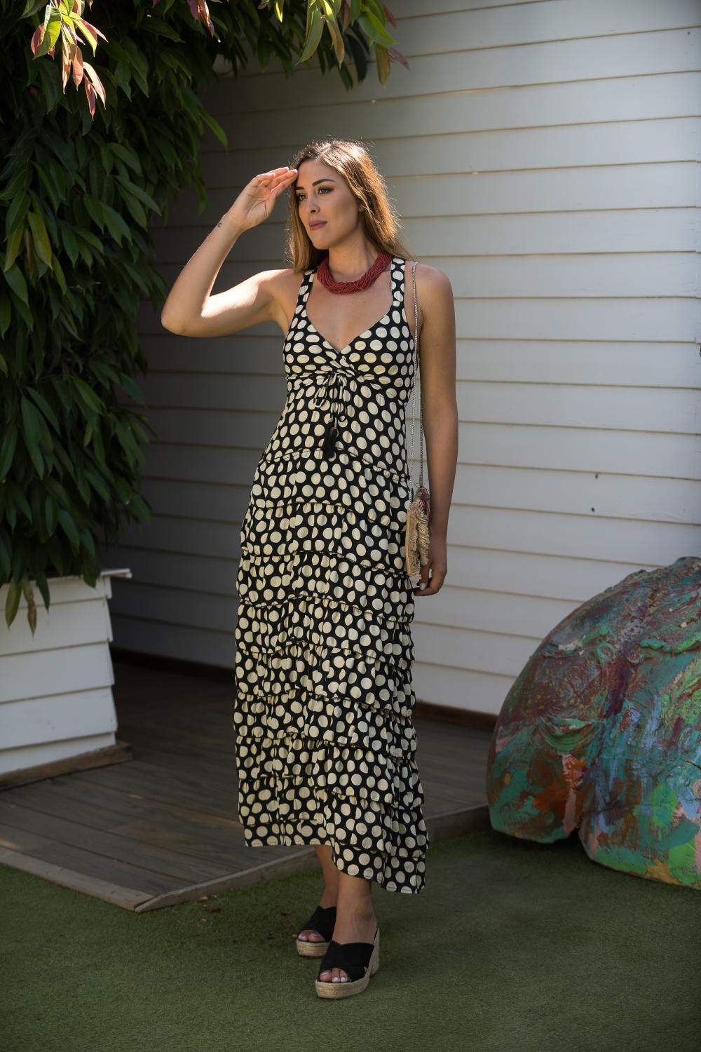Vestido cerdeña leticia en viscosa estampado de lunares grandes en verde, morados y esmeralda, escote bañera con cuerpo elástico volante en el bajo y adorno de pasamanería morado en la cintura.CALIDAD: 100% VISCOSE