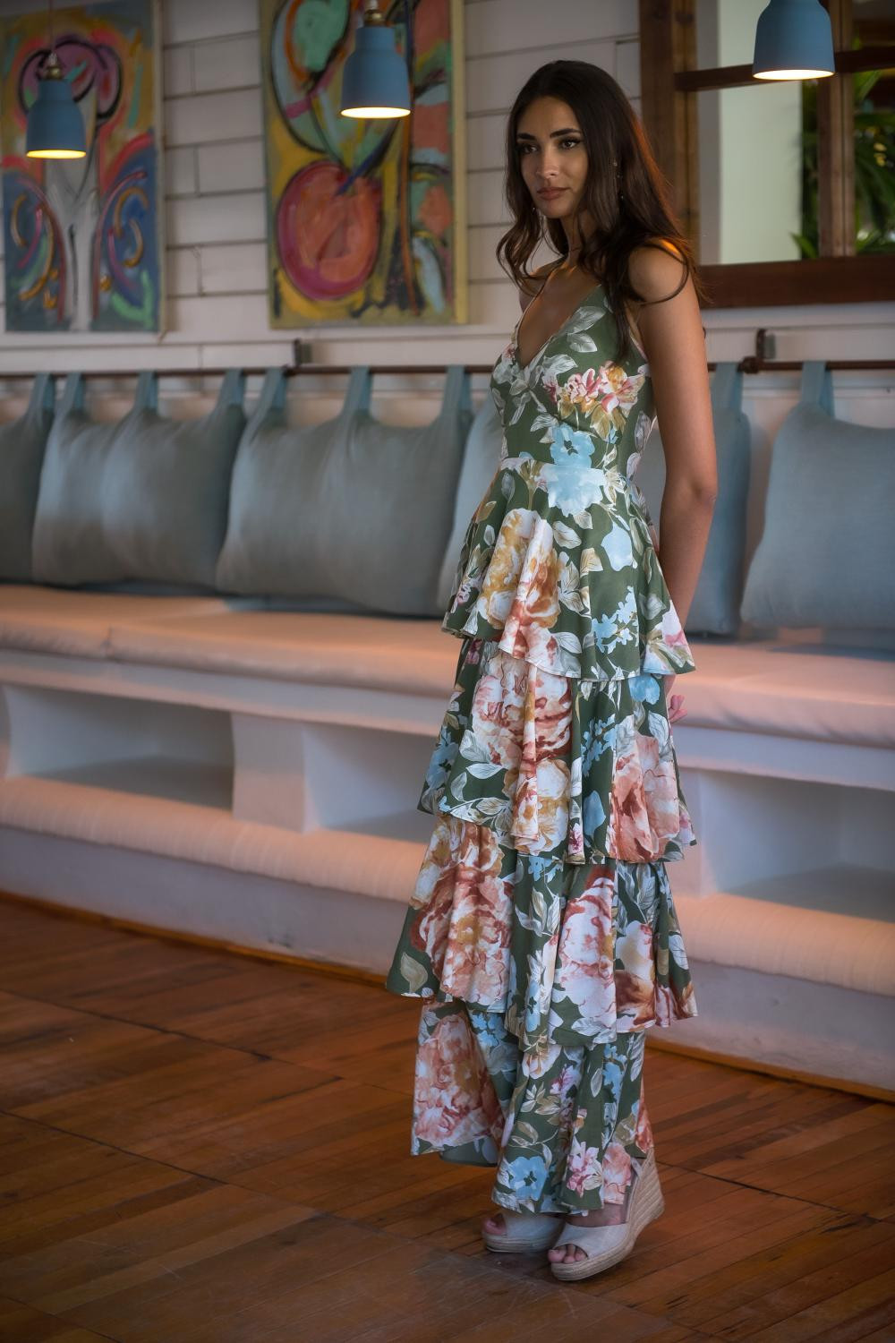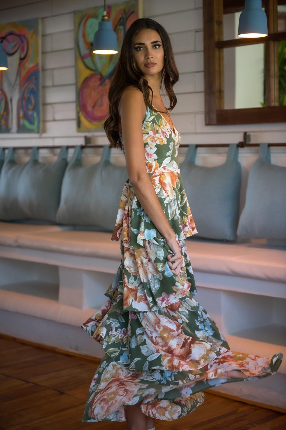 Vestido largo estampado , corpiño de tirantes y falda 4 volantes maxi, elstico fruncido en talle de espalda.