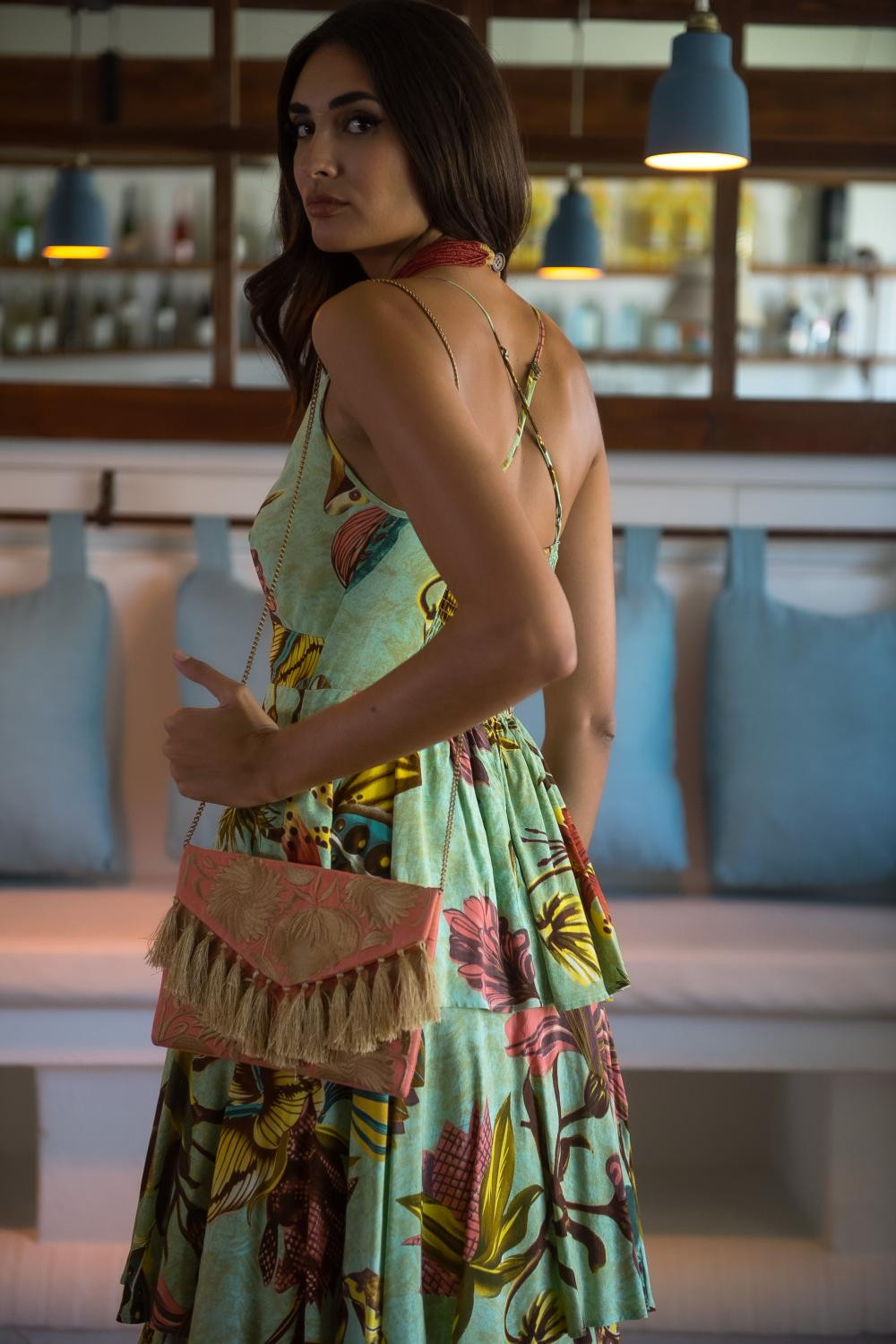 Vestido largo estampado Amazonic, verde con flores grandes multicolor , escote halter con detalles de cintas de crochet, espalda descubierta atada con nudo.COMPOSICIÓN: 100% VISCOSA