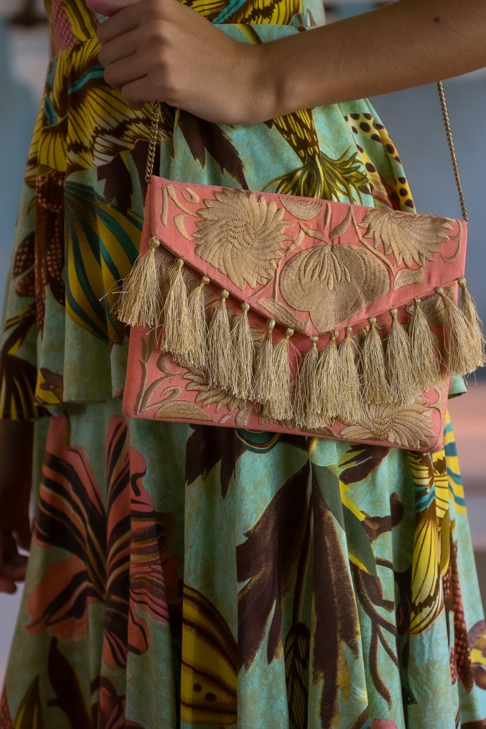 Vestido hada largo de gasa en estampado de fondo turquesa con casimir fucsias y naranjas manga francesa con volante ajustado a la cintura con cordón y borlones ni tonos fucsias escote cruzado.CALIDAD: GASA - 100%...