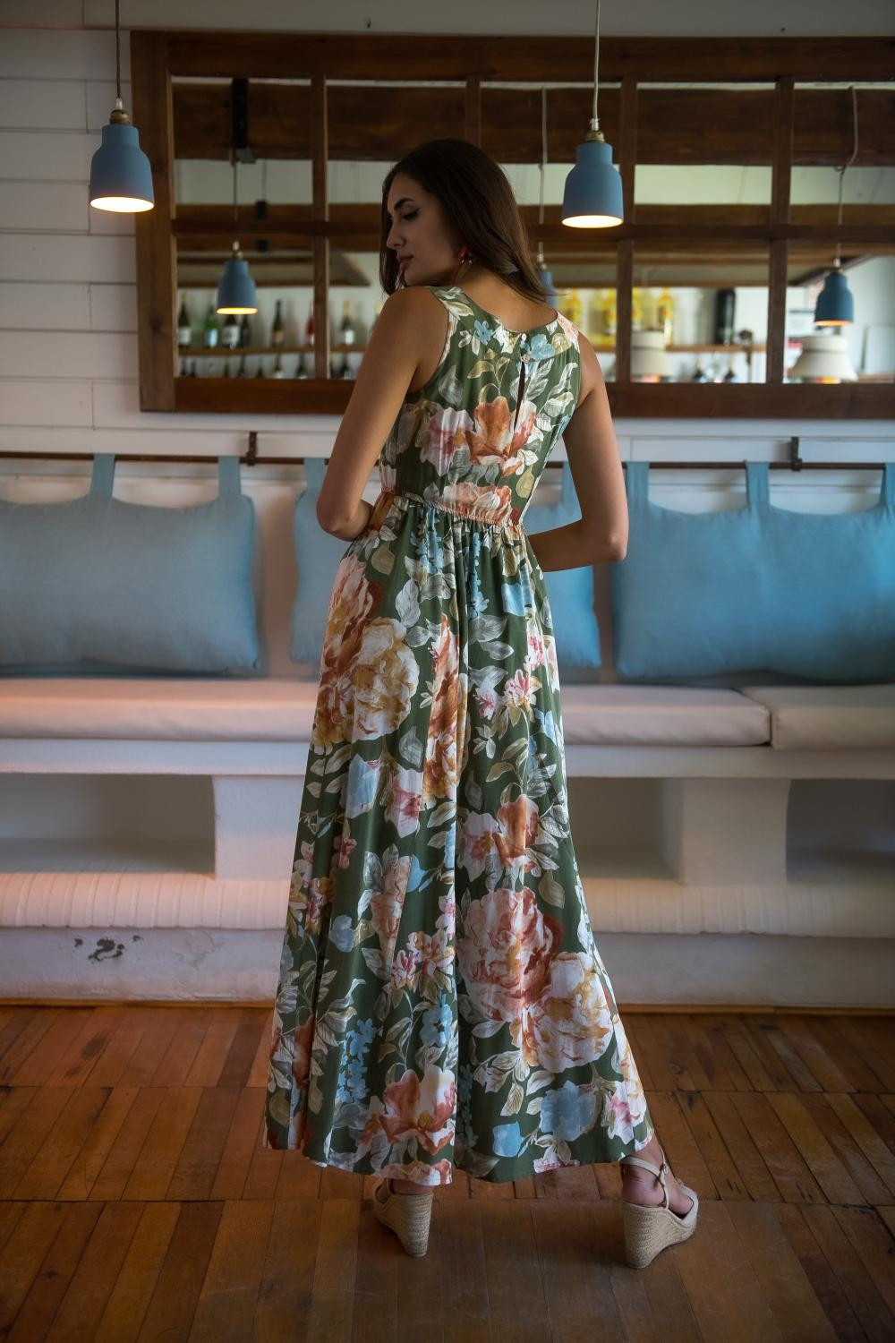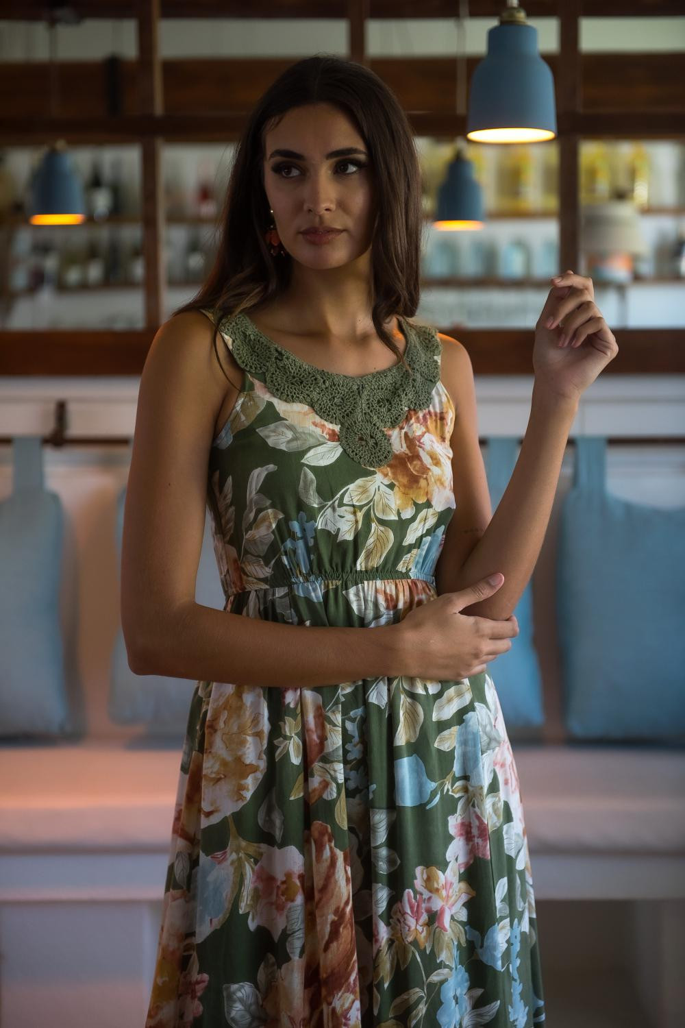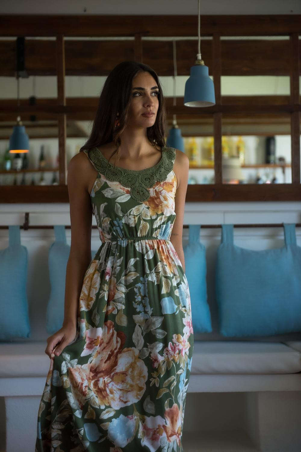 Vestido largo estampado Jardín Fluor, verde manzana con flores maxi multicolor, sin mangas y aplique en el cuello de crochet , cintura fruncidaCOMPOSICIÓN: 100% VISCOSA